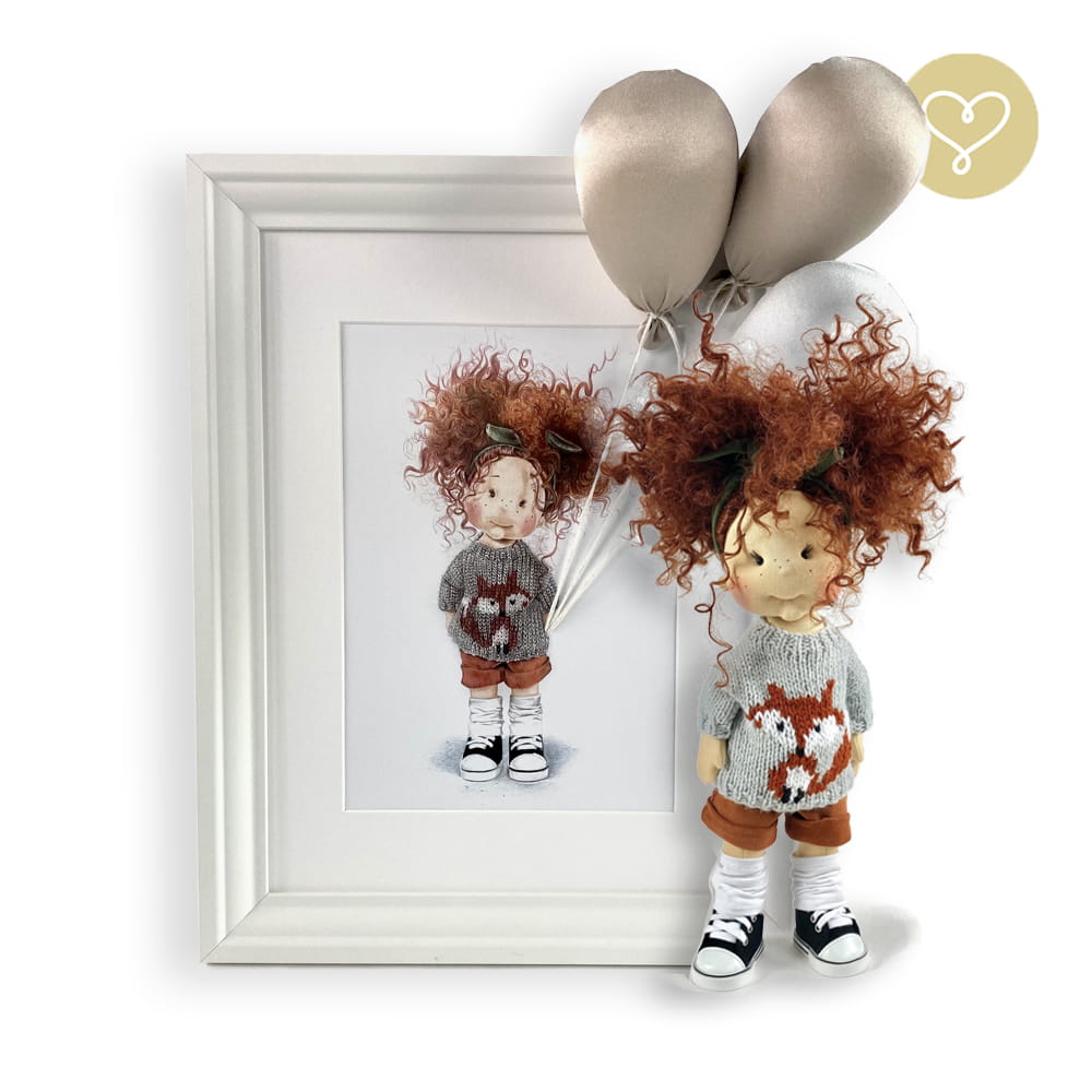 Reproduktion eines handgezeichneten Porträts meiner Puppe Roxy.