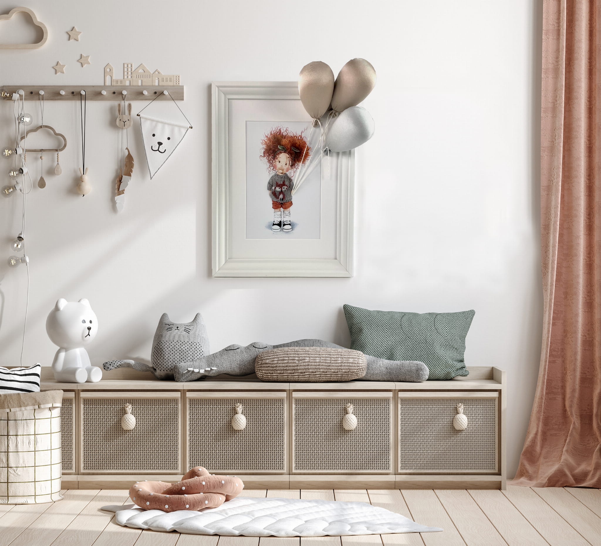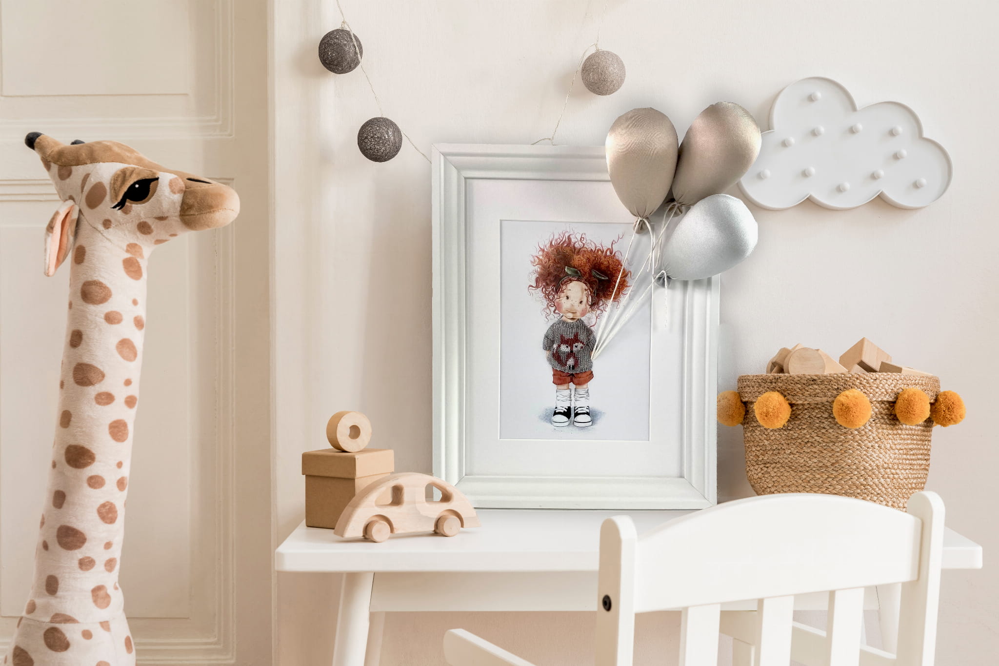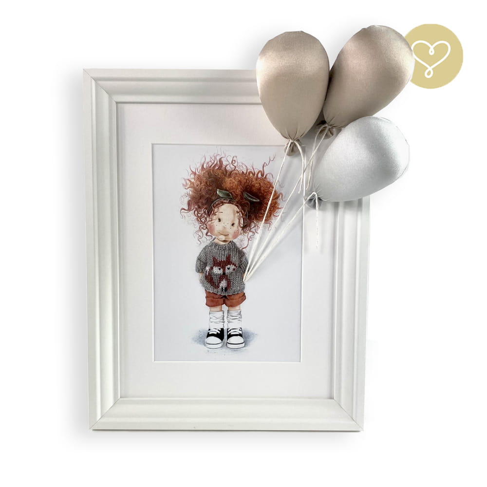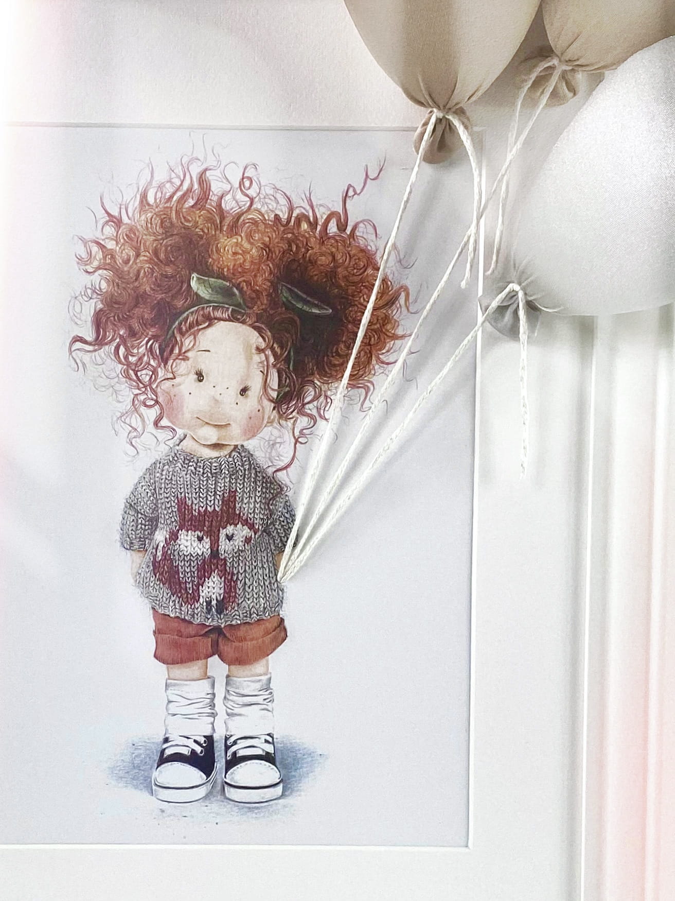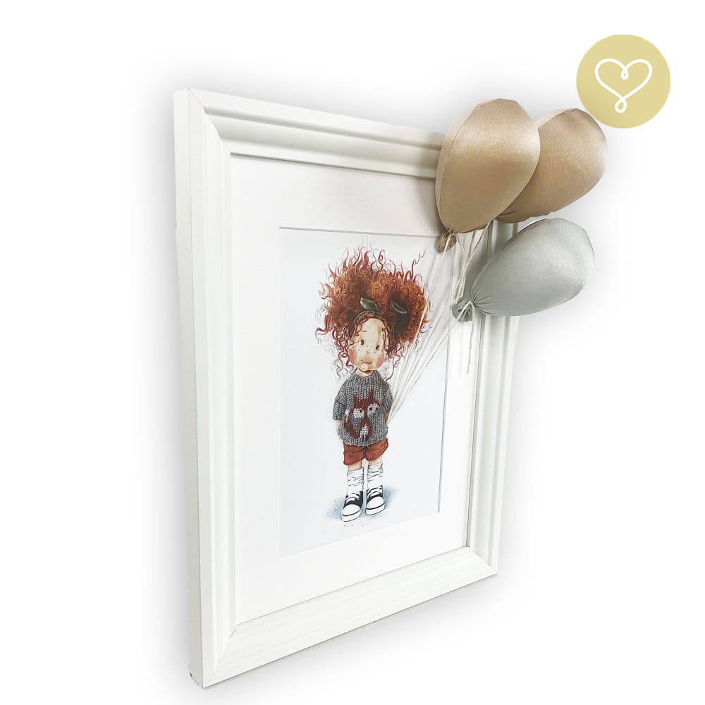 Ein besonderer und origineller Blickfang im Kinderzimmer, der nicht nur durch die einzigartige Zeichnung, sondern auch durch die 3D Elemente (Ballons ragen aus dem Rahmen) ins Auge fällt.