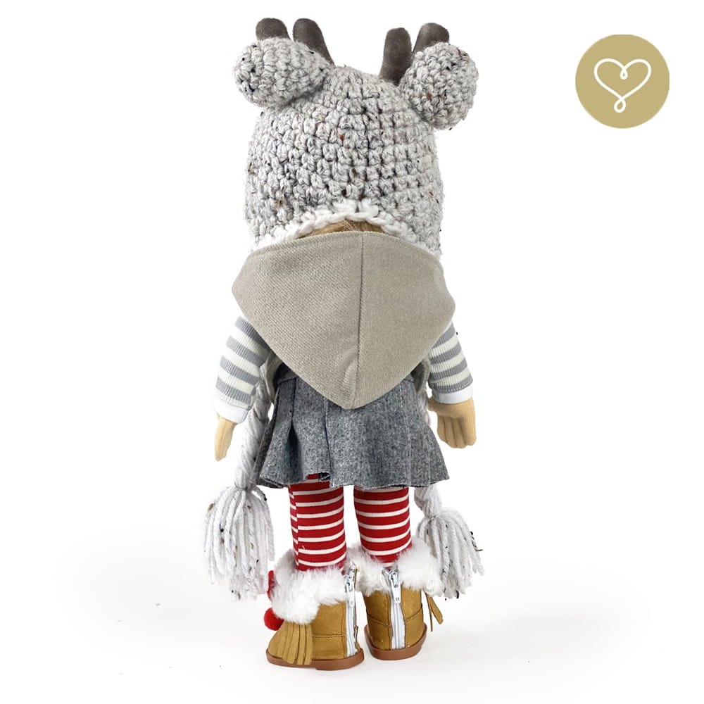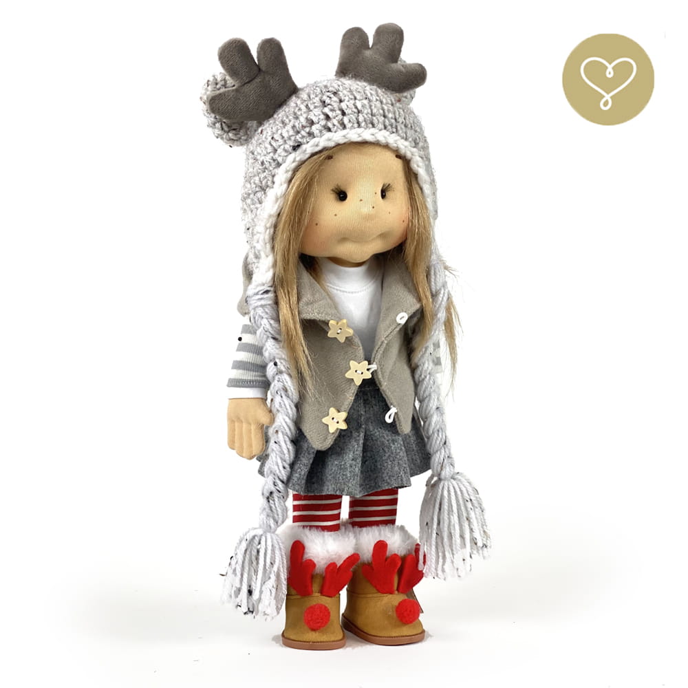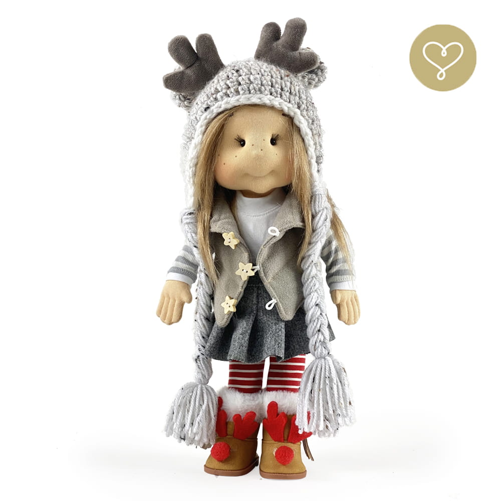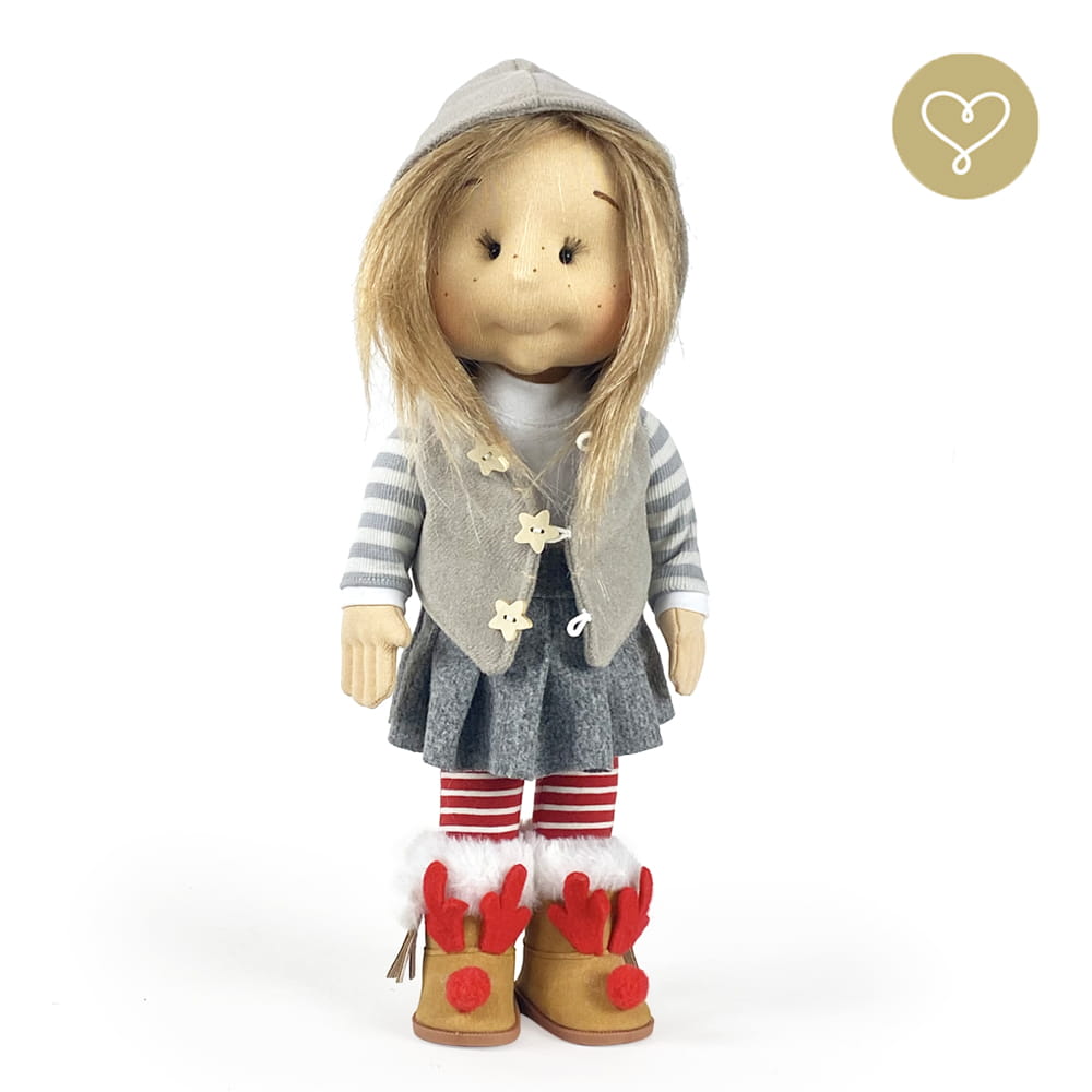 Die Liebe zum Detail und größte Sorgfalt steckt in jeder Faser dieser Puppe. Sie ist 40 cm groß, weich und sehr angenehm. Trotz dem Verzicht auf Drähte oder andere stabilisierende Elemente, kann eine LulluDoll selbstständig stehen und sitzen. Ihr Kopf und die Gliedmaßen sind beweglich. Das weiche Haar fühlt sich nahezu echt an, es lässt sich wunderbar frisieren und hat eine gute Kämmbarkeit. Die Materialien werden sorgsam ausgewählt, sind von höchster Qualität und Strapazierfähigkeit, weil die Sicherheit unerer Artikel höchste Priorität hat. Die Kleidung lässt sich leicht an- und umziehen. Im Shop unter dem Punkt Kleidung finden Sie weitere Kleidungsstücke im Angebot.