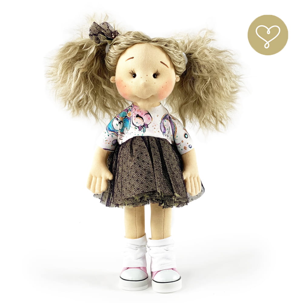 Handgemachte Stoffpuppe neu interpretiert. Genäht in der kleinen Manufaktur Lulludolls in Warschau.