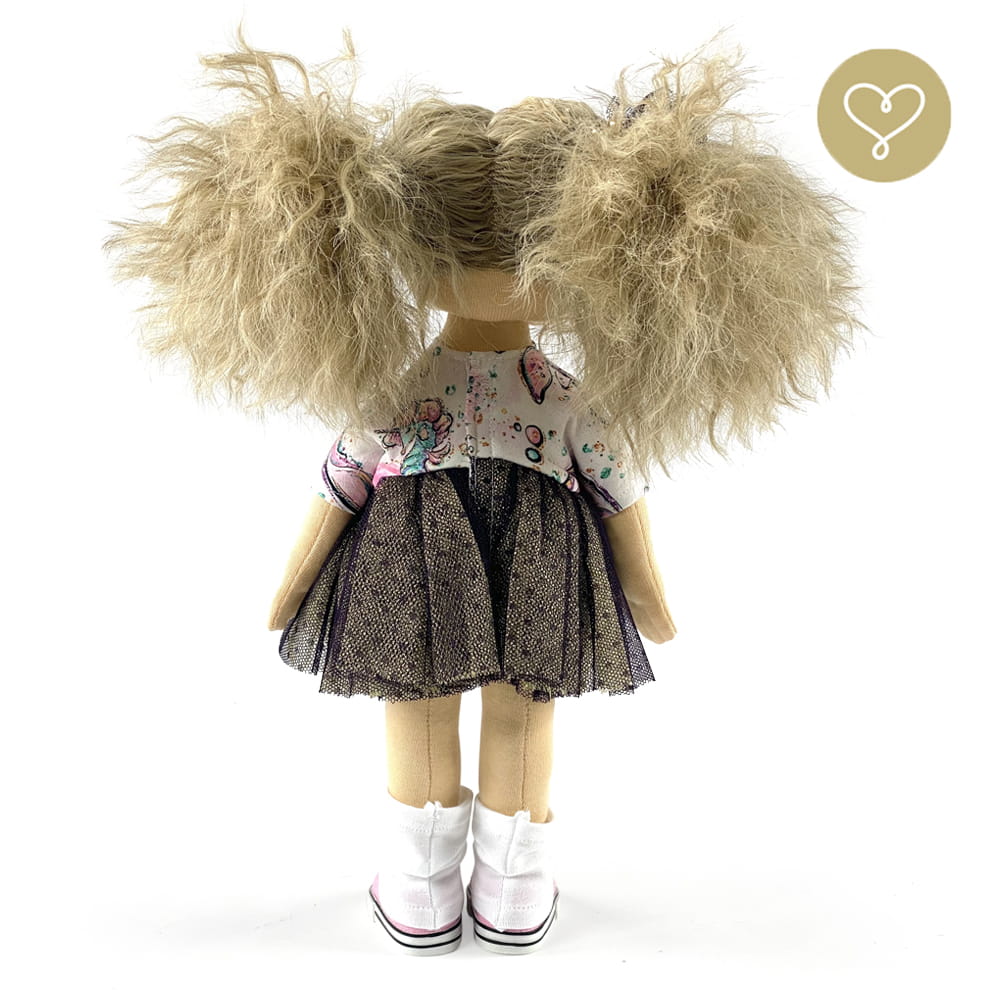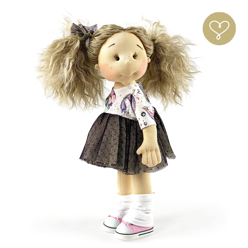 Die Liebe zum Detail und größte Sorgfalt steckt in jeder Faser dieser Puppe. Sie ist 40 cm groß, weich und sehr angenehm. Trotz dem Verzicht auf Drähte oder andere stabilisierende Elemente, kann eine LulluDoll selbstständig stehen und sitzen. Ihr Kopf und die Gliedmaßen sind beweglich. Das weiche Haar fühlt sich nahezu echt an, es lässt sich wunderbar frisieren und hat eine gute Kämmbarkeit. Die Materialien werden sorgsam ausgewählt, sind von höchster Qualität und Strapazierfähigkeit, weil die Sicherheit unerer Artikel höchste Priorität hat. Die Kleidung lässt sich leicht an- und umziehen. Im Shop unter dem Punkt Kleidung finden Sie weitere Kleidungsstücke im Angebot.