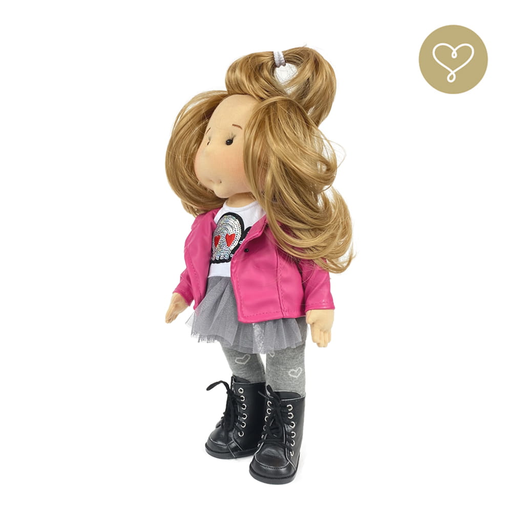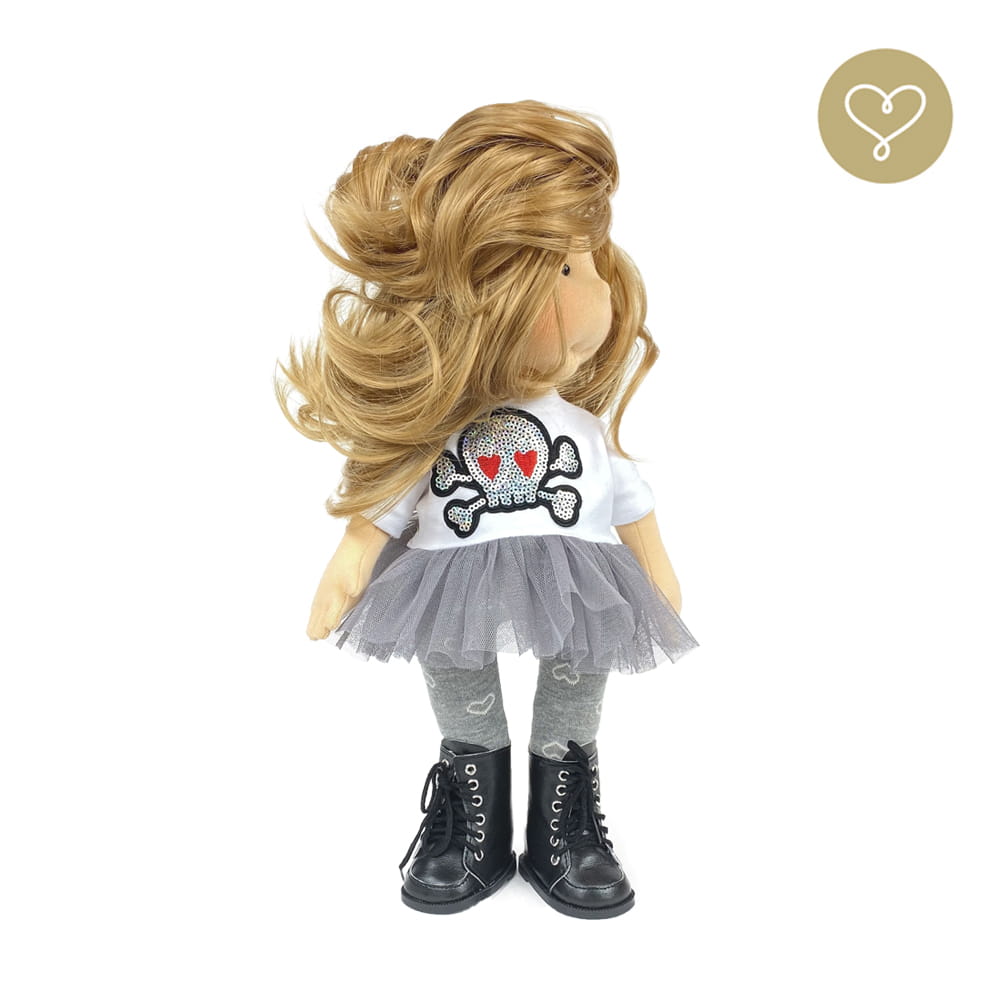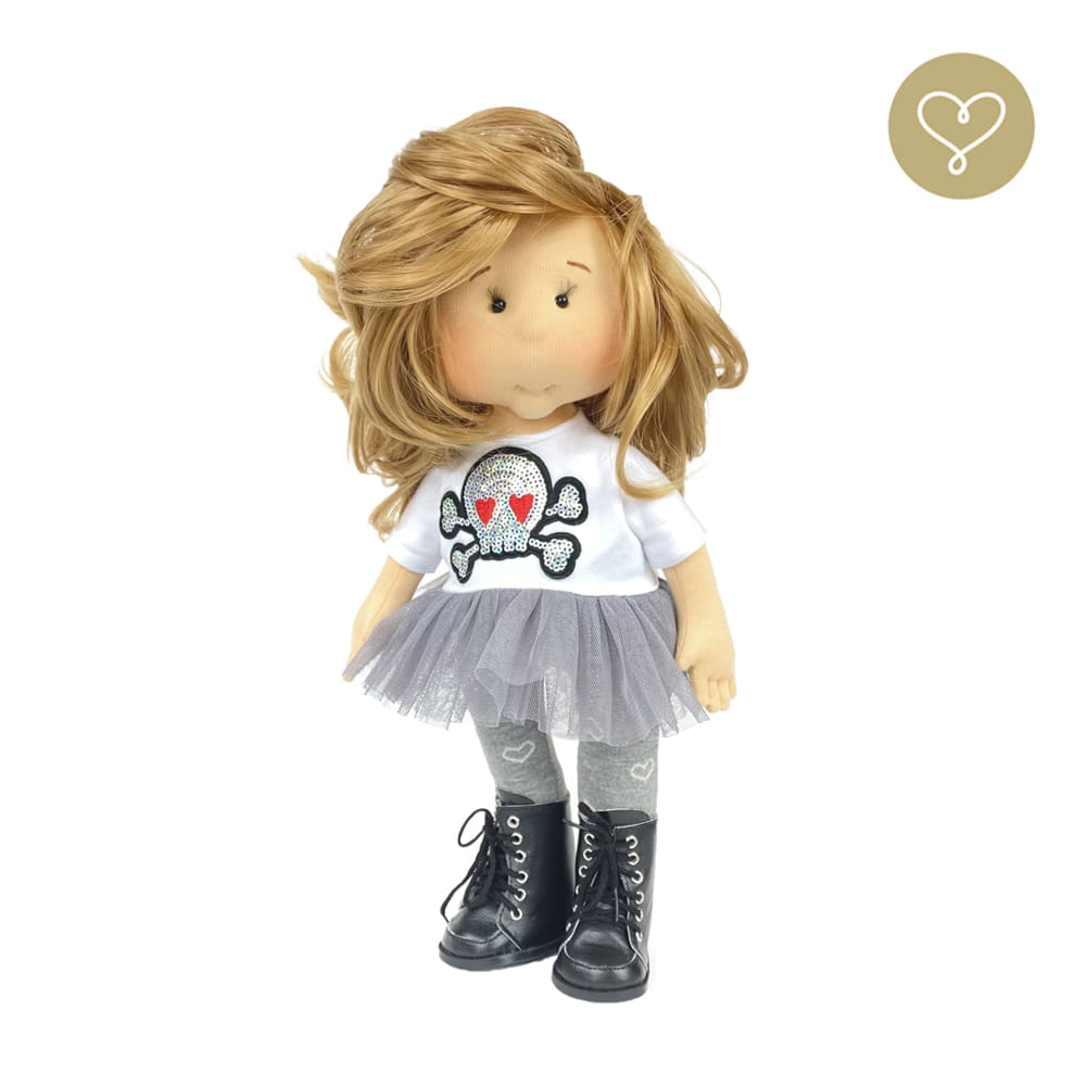Die Liebe zum Detail und größte Sorgfalt steckt in jeder Faser dieser Puppe. Sie ist 40 cm groß, weich und sehr angenehm. Trotz dem Verzicht auf Drähte oder andere stabilisierende Elemente, kann eine LulluDoll selbstständig stehen und sitzen. Ihr Kopf und die Gliedmaßen sind beweglich. Das weiche Haar fühlt sich nahezu echt an, es lässt sich wunderbar frisieren und hat eine gute Kämmbarkeit. Die Materialien werden sorgsam ausgewählt, sind von höchster Qualität und Strapazierfähigkeit, weil die Sicherheit unerer Artikel höchste Priorität hat. Die Kleidung lässt sich leicht an- und umziehen. Im Shop unter dem Punkt Kleidung finden Sie weitere Kleidungsstücke im Angebot.