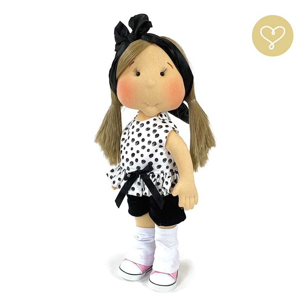 Die Liebe zum Detail und größte Sorgfalt steckt in jeder Faser dieser Puppe. Sie ist 40 cm groß, weich und sehr angenehm. Trotz dem Verzicht auf Drähte oder andere stabilisierende Elemente, kann eine LulluDoll selbstständig stehen und sitzen. Ihr Kopf und die Gliedmaßen sind beweglich. Das weiche Haar fühlt sich nahezu echt an, es lässt sich wunderbar frisieren und hat eine gute Kämmbarkeit. Die Materialien werden sorgsam ausgewählt, sind von höchster Qualität und Strapazierfähigkeit, weil die Sicherheit unerer Artikel höchste Priorität hat. Die Kleidung lässt sich leicht an- und umziehen. Im Shop unter dem Punkt Kleidung finden Sie weitere Kleidungsstücke im Angebot.