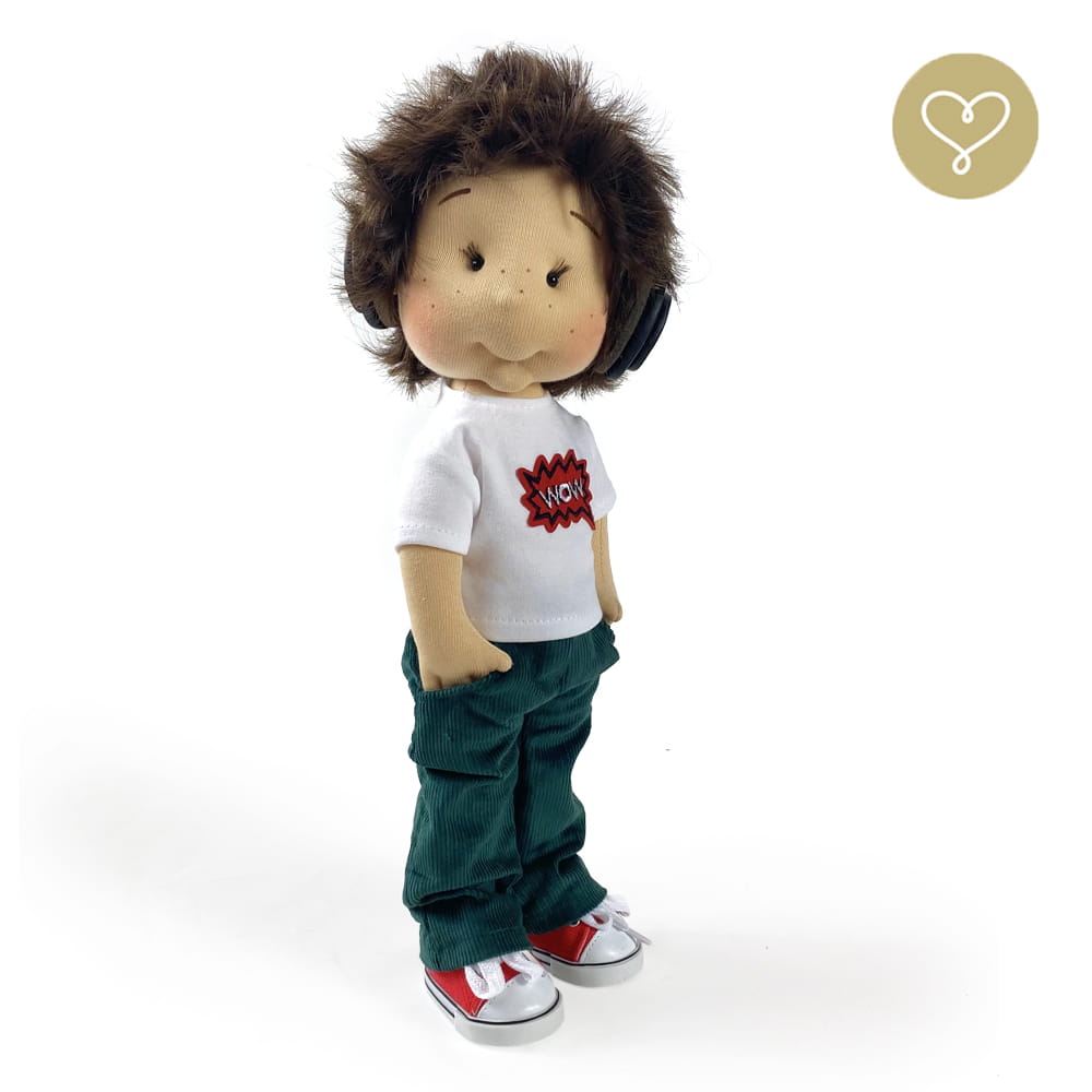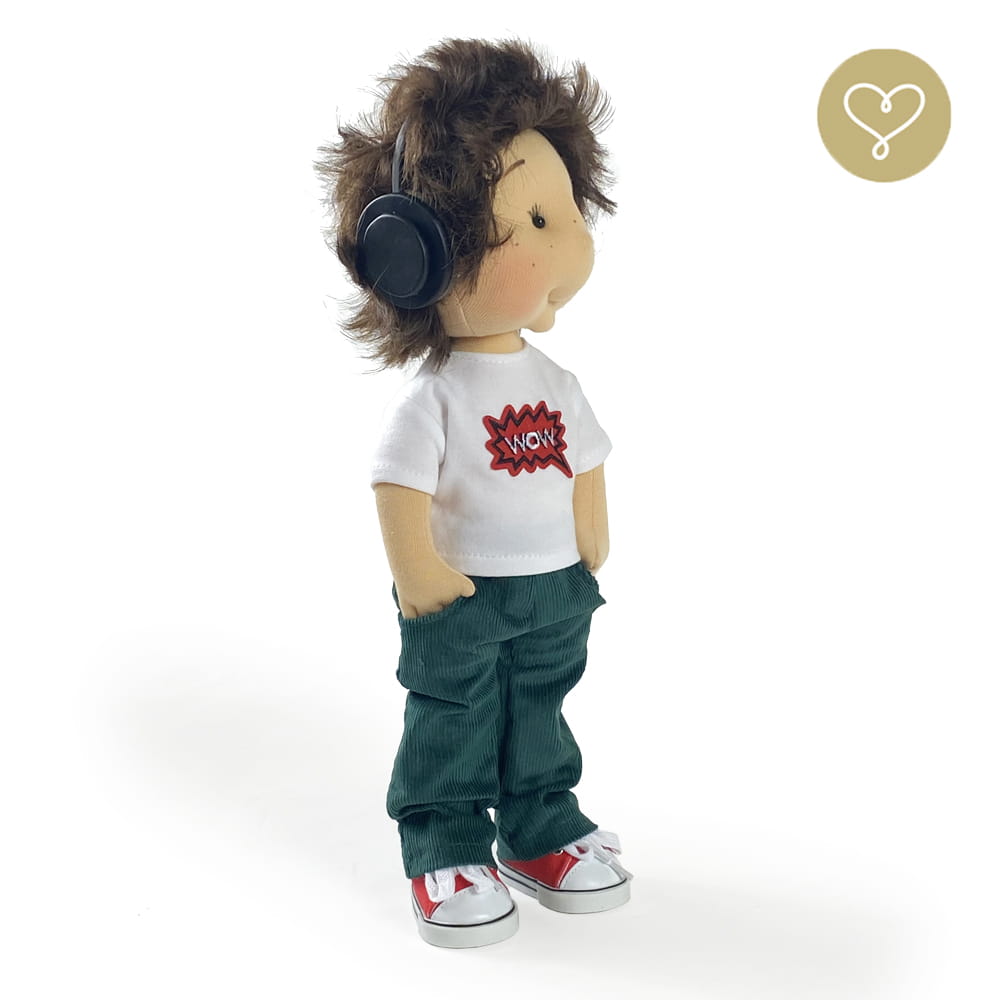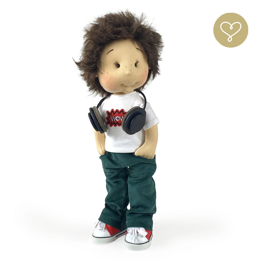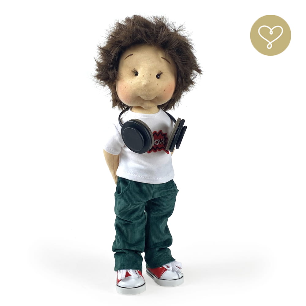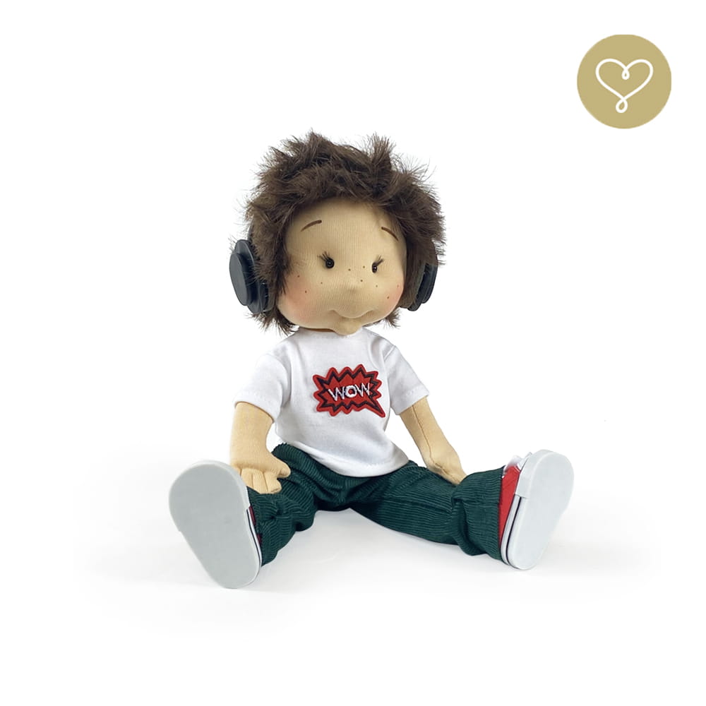 Die Liebe zum Detail und größte Sorgfalt steckt in jeder Faser dieser Puppe. Sie ist 40 cm groß, weich und sehr angenehm. Trotz dem Verzicht auf Drähte oder andere stabilisierende Elemente, kann eine LulluDoll selbstständig stehen und sitzen. Ihr Kopf und die Gliedmaßen sind beweglich. Das weiche Haar fühlt sich nahezu echt an, es lässt sich wunderbar frisieren und hat eine gute Kämmbarkeit. Die Materialien werden sorgsam ausgewählt, sind von höchster Qualität und Strapazierfähigkeit, weil die Sicherheit unerer Artikel höchste Priorität hat. Die Kleidung lässt sich leicht an- und umziehen. Im Shop unter dem Punkt Kleidung finden Sie weitere Kleidungsstücke im Angebot.