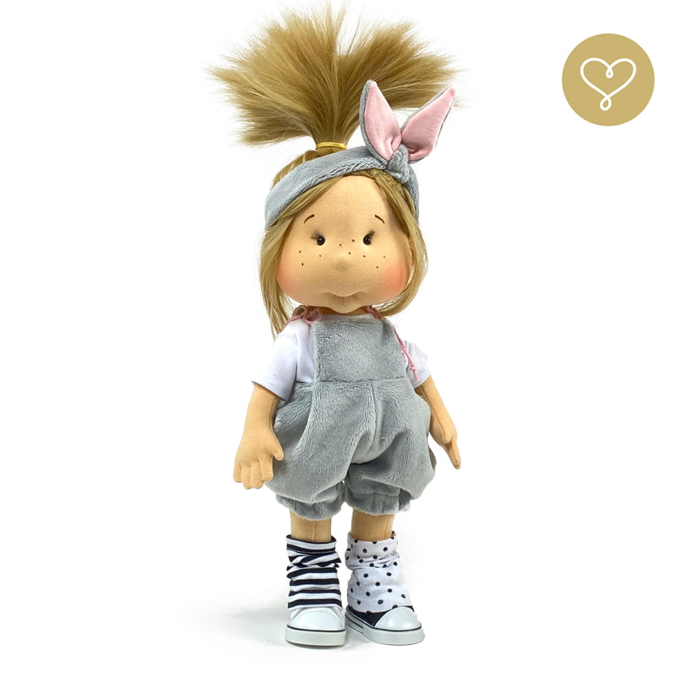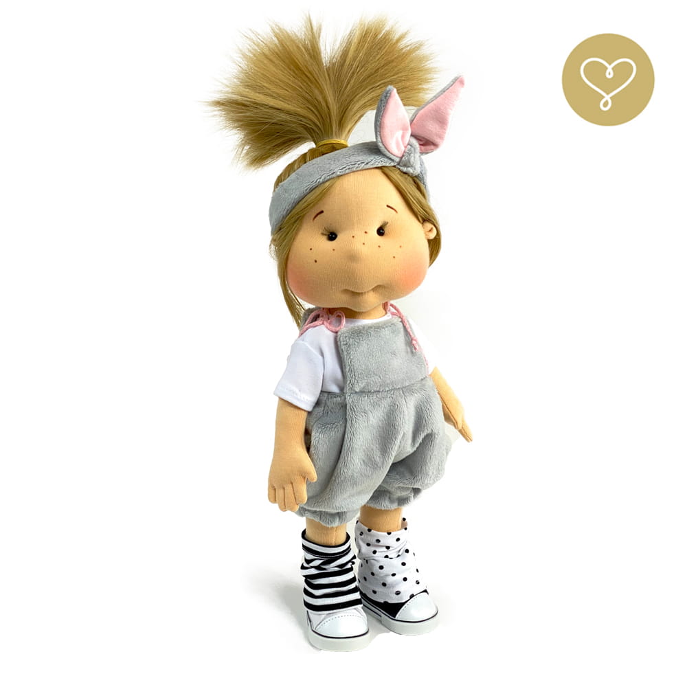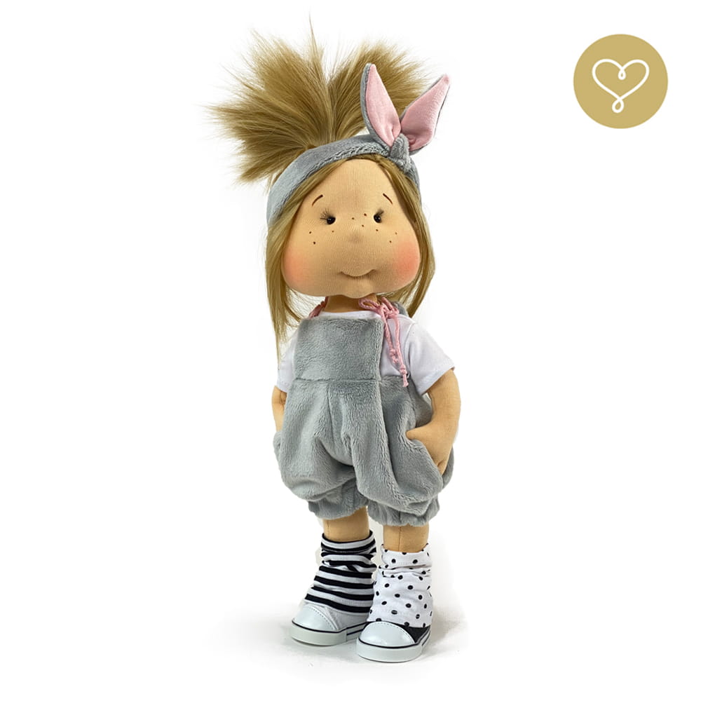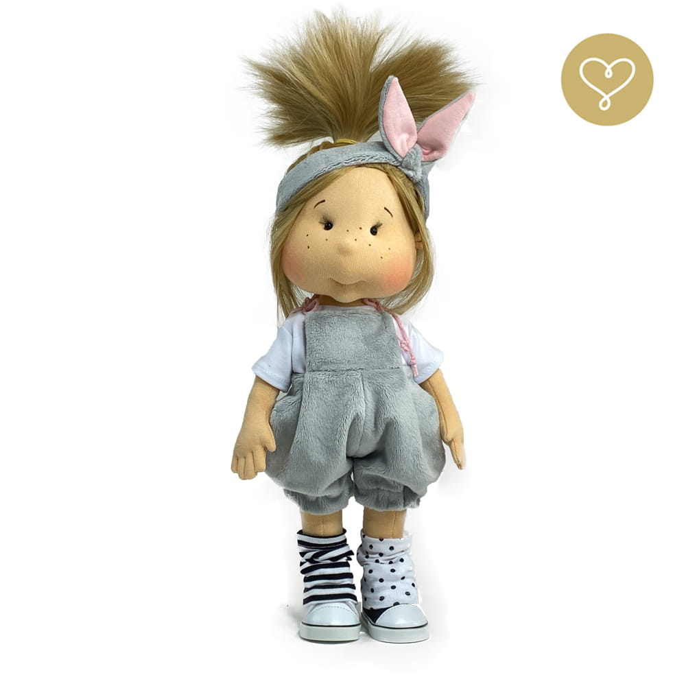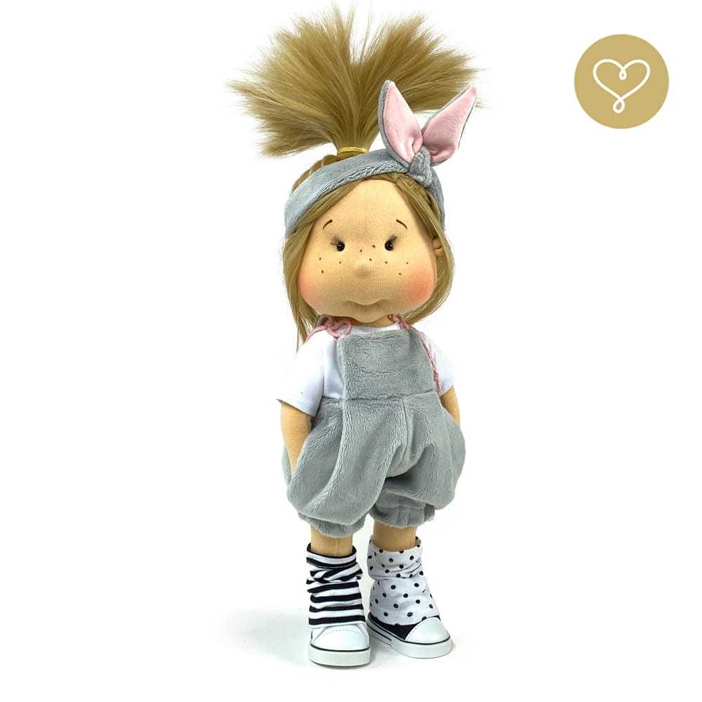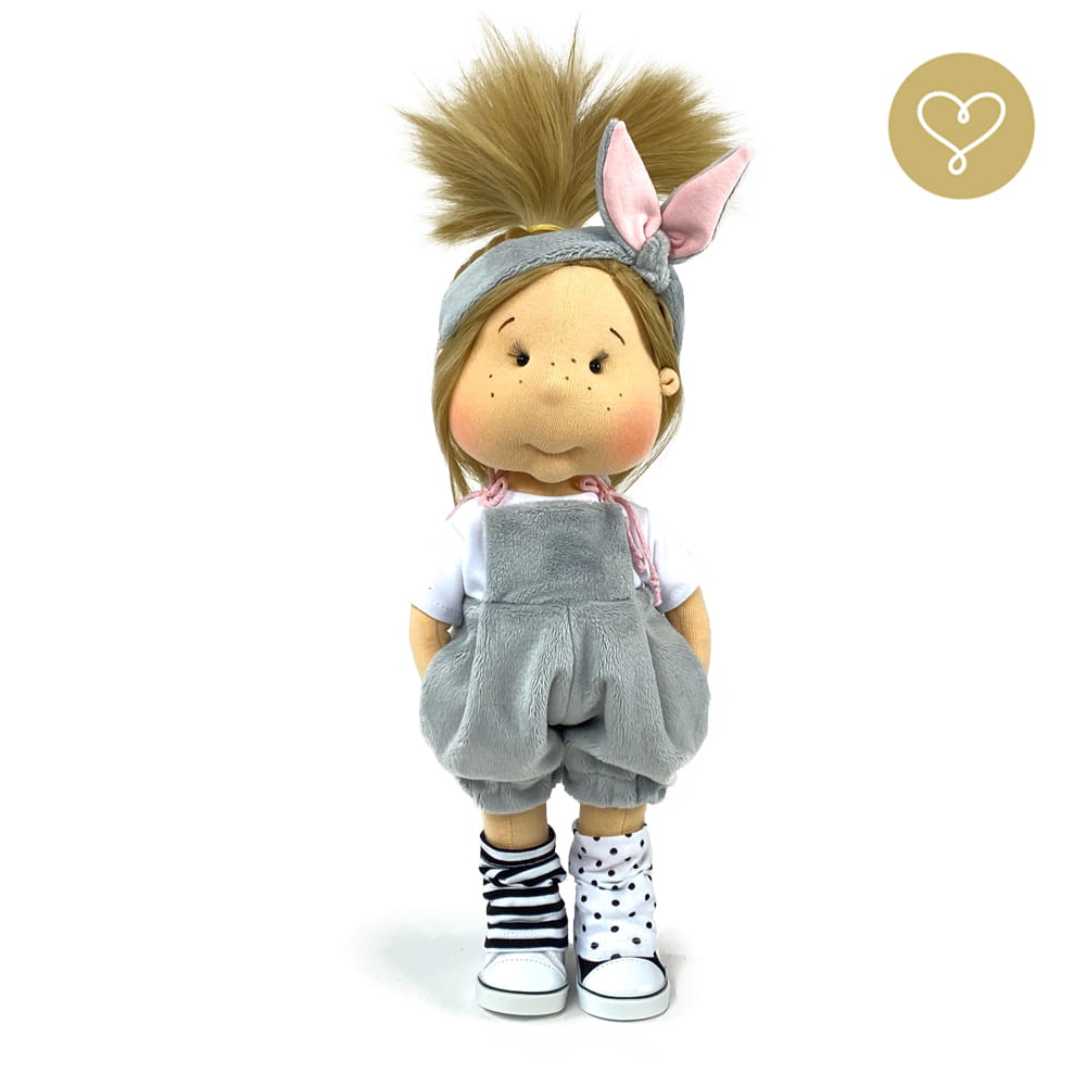 Die Liebe zum Detail und größte Sorgfalt steckt in jeder Faser dieser Puppe. Sie ist 40 cm groß, weich und sehr angenehm. Trotz dem Verzicht auf Drähte oder andere stabilisierende Elemente, kann eine LulluDoll selbstständig stehen und sitzen. Ihr Kopf und die Gliedmaßen sind beweglich. Das weiche Haar fühlt sich nahezu echt an, es lässt sich wunderbar frisieren und hat eine gute Kämmbarkeit. Die Materialien werden sorgsam ausgewählt, sind von höchster Qualität und Strapazierfähigkeit, weil die Sicherheit unerer Artikel höchste Priorität hat. Die Kleidung lässt sich leicht an- und umziehen. Im Shop unter dem Punkt Kleidung finden Sie weitere Kleidungsstücke im Angebot.