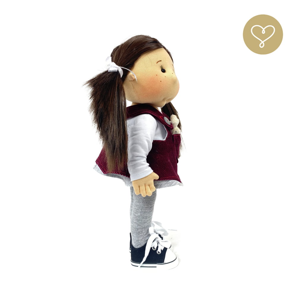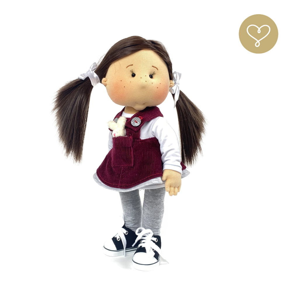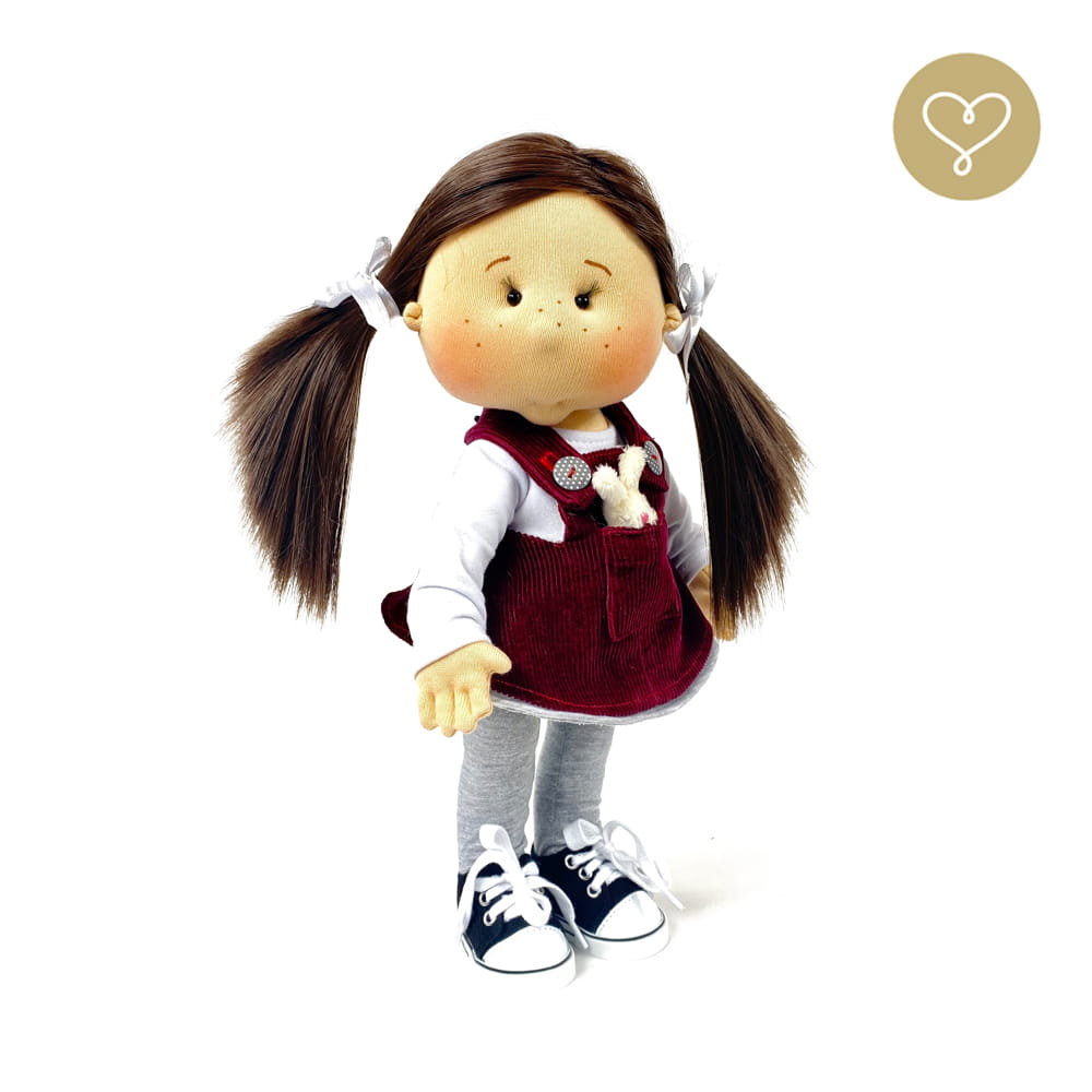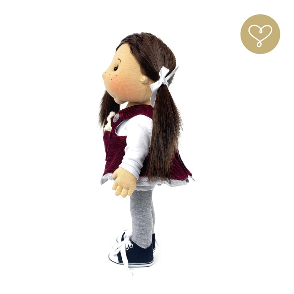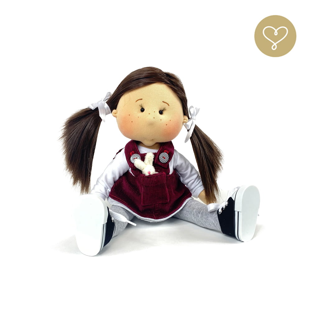 Die Liebe zum Detail und größte Sorgfalt steckt in jeder Faser dieser Puppe. Sie ist 40 cm groß, weich und sehr angenehm. Trotz dem Verzicht auf Drähte oder andere stabilisierende Elemente, kann eine LulluDoll selbstständig stehen und sitzen. Ihr Kopf und die Gliedmaßen sind beweglich. Das weiche Haar fühlt sich nahezu echt an, es lässt sich wunderbar frisieren und hat eine gute Kämmbarkeit. Die Materialien werden sorgsam ausgewählt, sind von höchster Qualität und Strapazierfähigkeit, weil die Sicherheit unerer Artikel höchste Priorität hat. Die Kleidung lässt sich leicht an- und umziehen. Im Shop unter dem Punkt Kleidung finden Sie weitere Kleidungsstücke im Angebot.