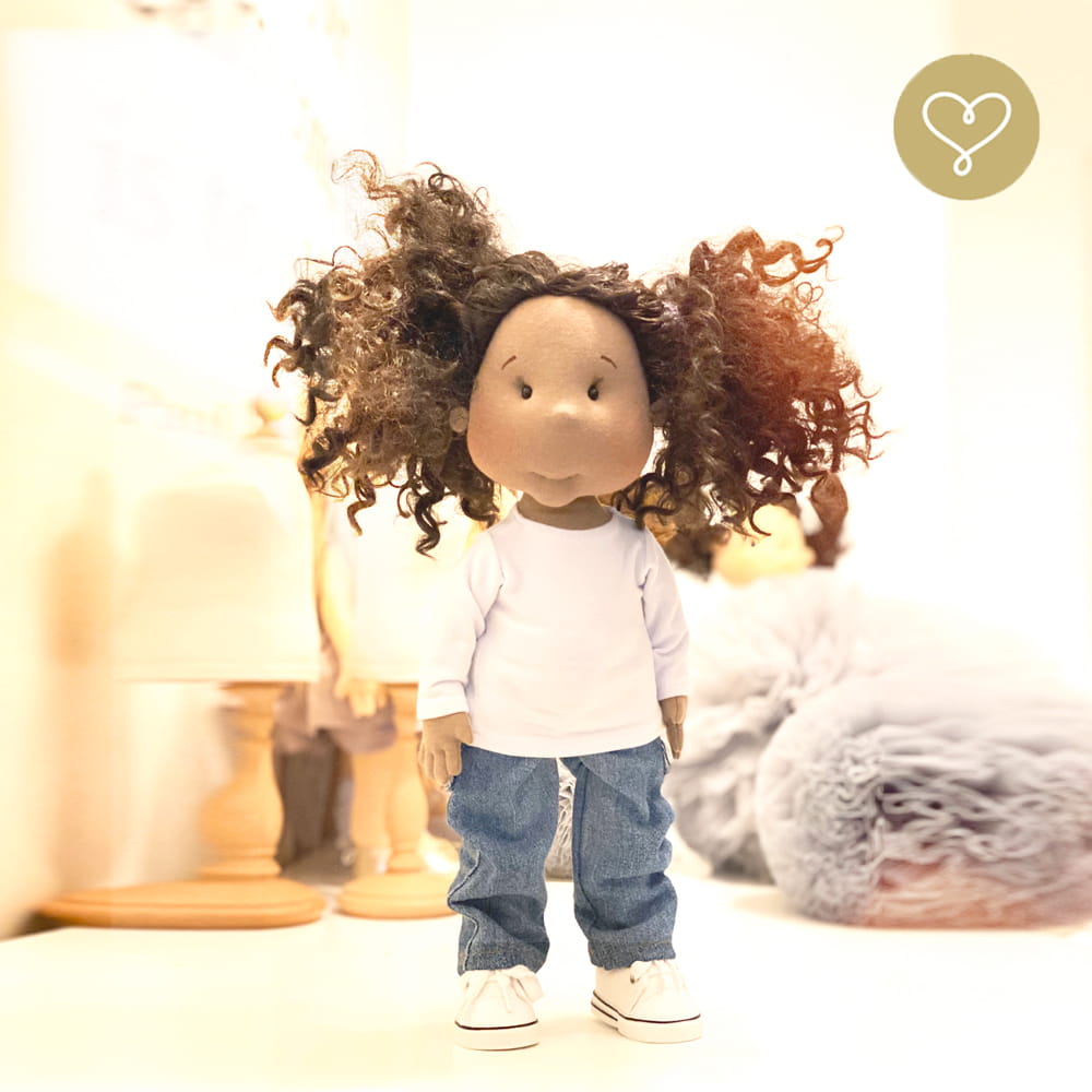 Die Liebe zum Detail und größte Sorgfalt steckt in jeder Faser dieser Puppe. Sie ist 40 cm groß, weich und sehr angenehm. Trotz dem Verzicht auf Drähte oder andere stabilisierende Elemente, kann eine LulluDoll selbstständig stehen und sitzen. Ihr Kopf und die Gliedmaßen sind beweglich. Das weiche Haar fühlt sich nahezu echt an, es lässt sich wunderbar frisieren und hat eine gute Kämmbarkeit. Die Materialien werden sorgsam ausgewählt, sind von höchster Qualität und Strapazierfähigkeit, weil die Sicherheit unerer Artikel höchste Priorität hat. Die Kleidung lässt sich leicht an- und umziehen. Im Shop unter dem Punkt Kleidung finden Sie weitere Kleidungsstücke im Angebot.