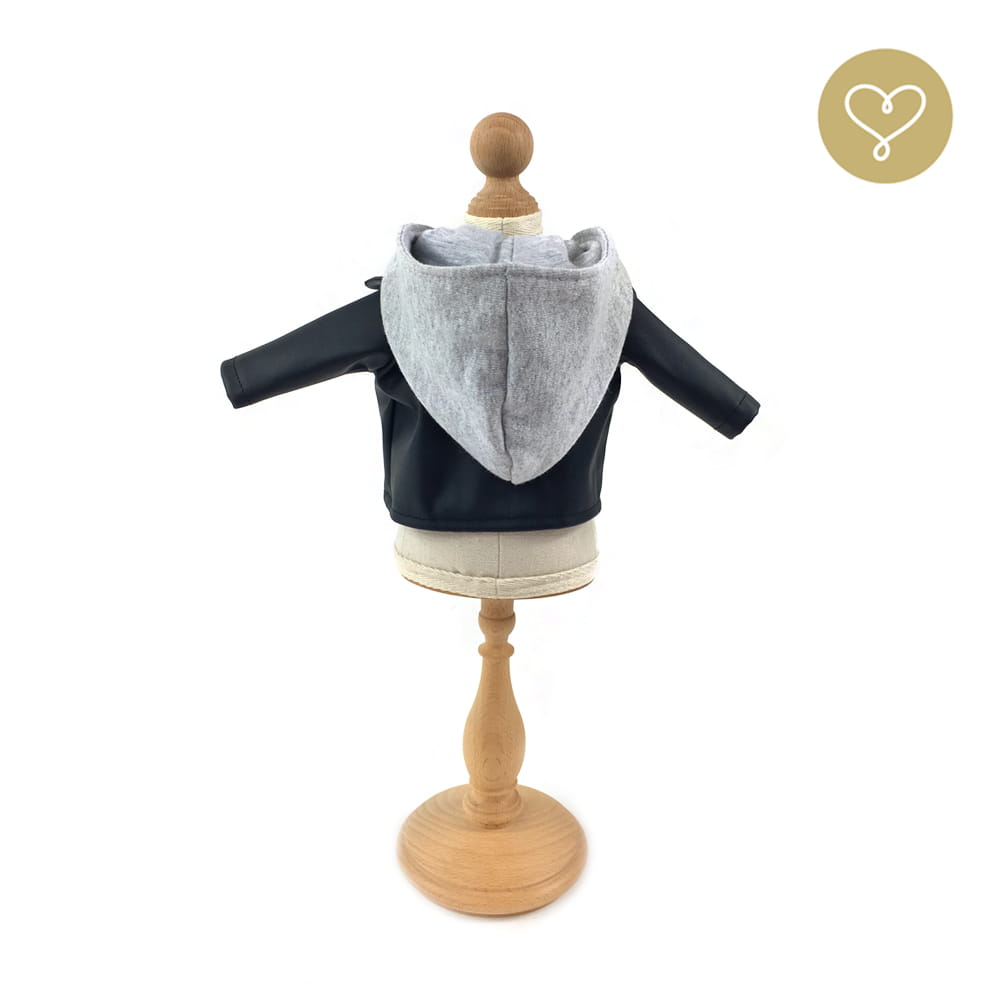 Eine schwarze Lederjacke aus Lederimitat mit Stoffkapuze