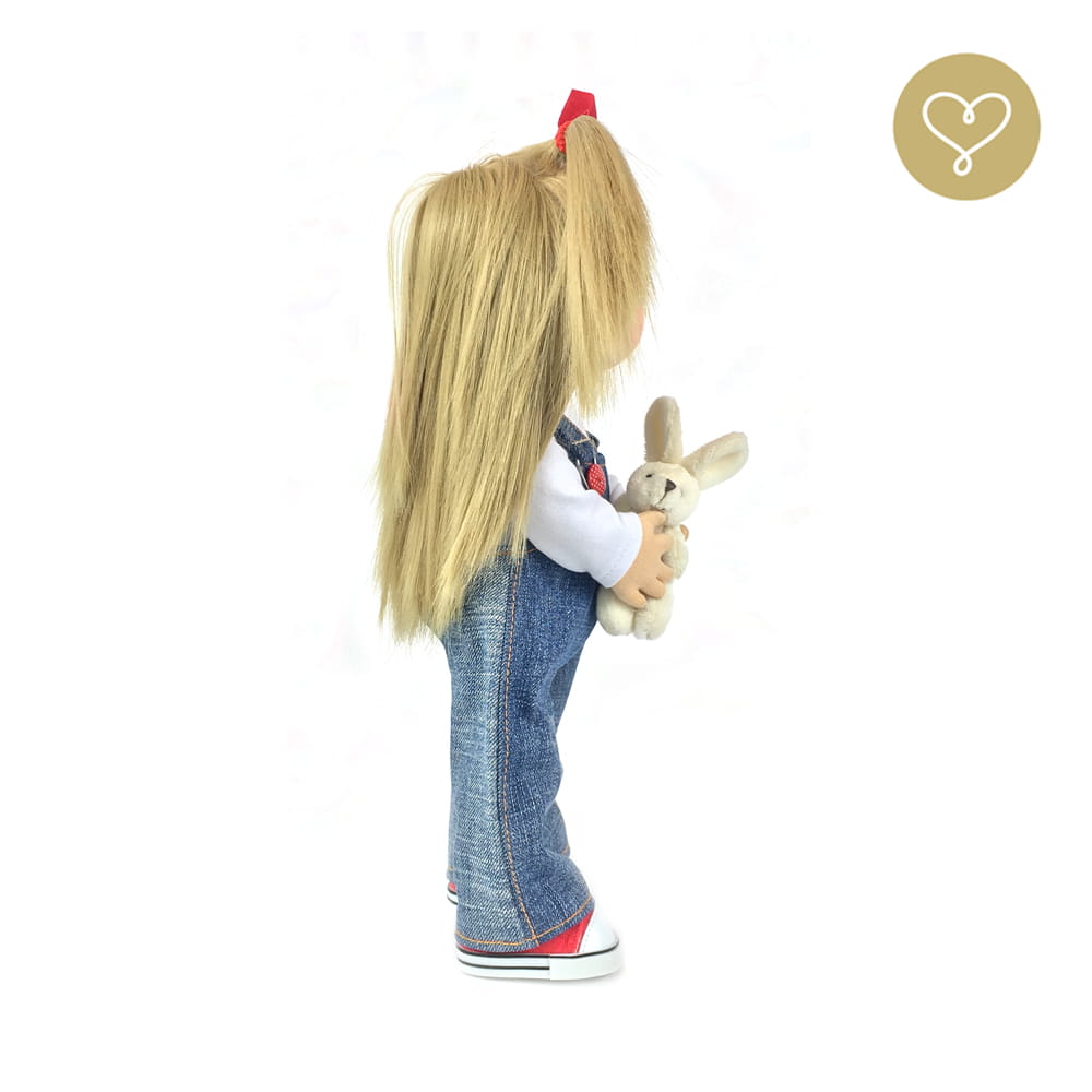 Die Liebe zum Detail und größte Sorgfalt steckt in jeder Faser dieser Puppe. Sie ist 40 cm groß, weich und sehr angenehm. Trotz dem Verzicht auf Drähte oder andere stabilisierende Elemente, kann eine LulluDoll selbstständig stehen und sitzen. Ihr Kopf und die Gliedmaßen sind beweglich. Das weiche Haar fühlt sich nahezu echt an, es lässt sich wunderbar frisieren und hat eine gute Kämmbarkeit. Die Materialien werden sorgsam ausgewählt, sind von höchster Qualität und Strapazierfähigkeit, weil die Sicherheit unerer Artikel höchste Priorität hat. Die Kleidung lässt sich leicht an- und umziehen. Im Shop unter dem Punkt Kleidung finden Sie weitere Kleidungsstücke im Angebot.