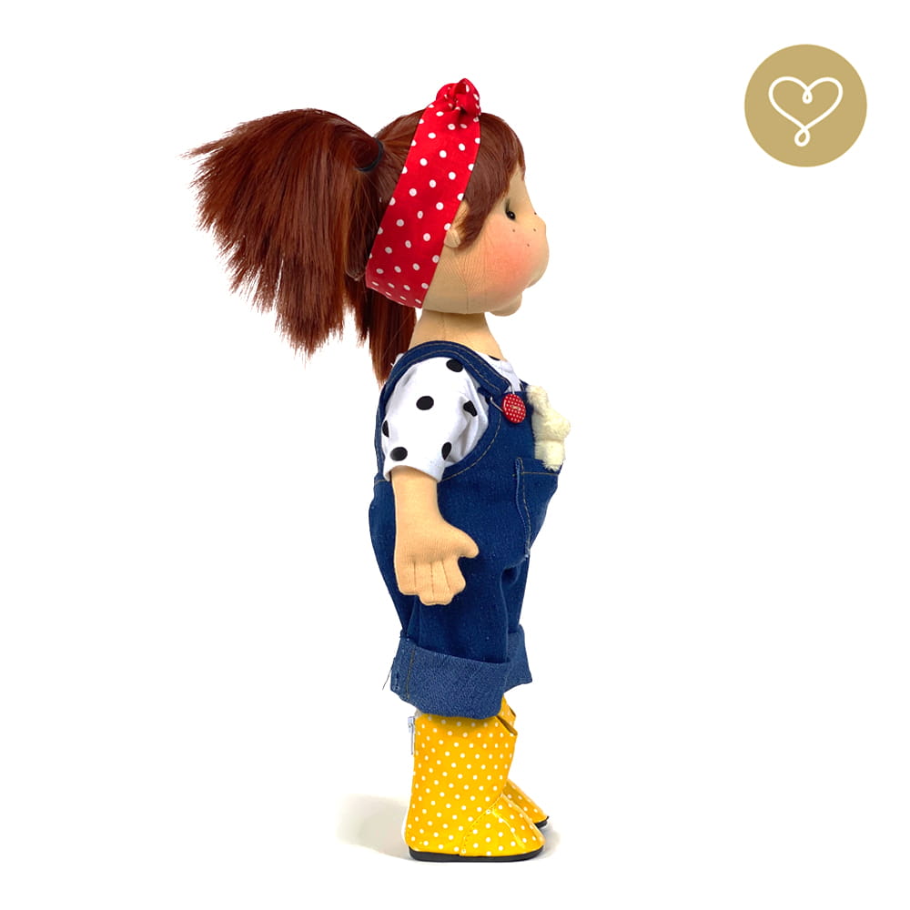 Die Liebe zum Detail und größte Sorgfalt steckt in jeder Faser dieser Puppe. Sie ist 40 cm groß, weich und sehr angenehm. Trotz dem Verzicht auf Drähte oder andere stabilisierende Elemente, kann eine LulluDoll selbstständig stehen und sitzen. Ihr Kopf und die Gliedmaßen sind beweglich. Das weiche Haar fühlt sich nahezu echt an, es lässt sich wunderbar frisieren und hat eine gute Kämmbarkeit. Die Materialien werden sorgsam ausgewählt, sind von höchster Qualität und Strapazierfähigkeit, weil die Sicherheit unerer Artikel höchste Priorität hat. Die Kleidung lässt sich leicht an- und umziehen. Im Shop unter dem Punkt Kleidung, finden Sie weitere Kleidungsstücke im Angebot.