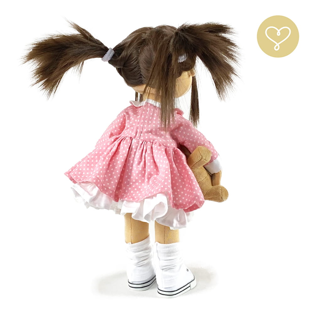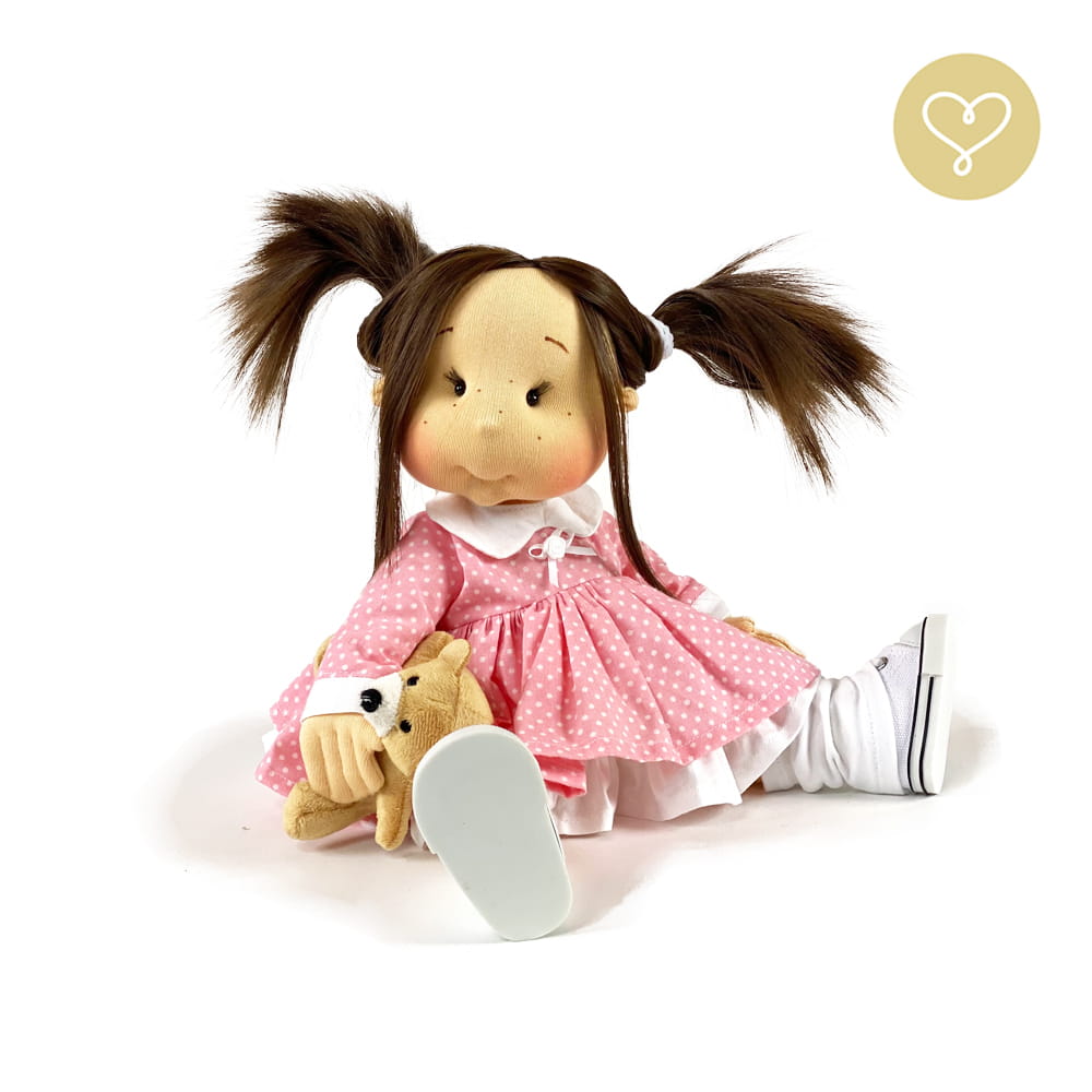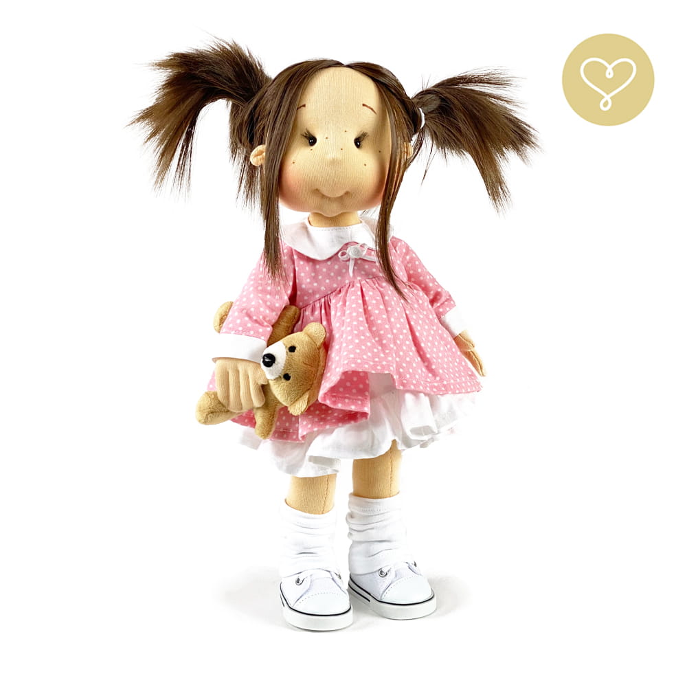 Die Liebe zum Detail und größte Sorgfalt steckt in jeder Faser dieser Puppe. Sie ist 40 cm groß, weich und sehr angenehm. Trotz dem Verzicht auf Drähte oder andere stabilisierende Elemente, kann eine LulluDoll selbstständig stehen und sitzen. Ihr Kopf und die Gliedmaßen sind beweglich. Das weiche Haar fühlt sich nahezu echt an, es lässt sich wunderbar frisieren und hat eine gute Kämmbarkeit. Die Materialien werden sorgsam ausgewählt, sind von höchster Qualität und Strapazierfähigkeit, weil die Sicherheit unerer Artikel höchste Priorität hat. Die Kleidung lässt sich leicht an- und umziehen. Im Shop unter dem Punkt Kleidung finden Sie weitere Kleidungsstücke im Angebot.
