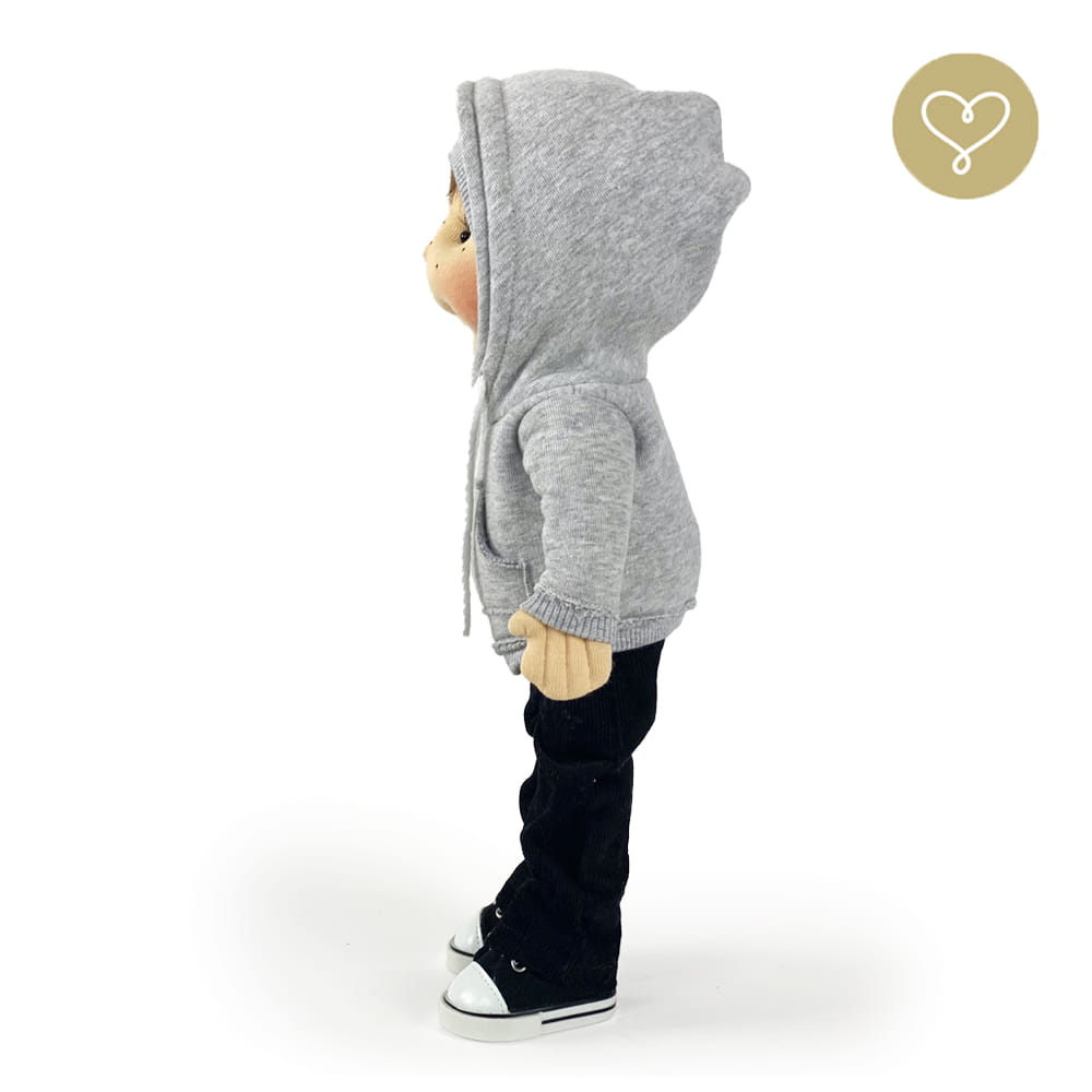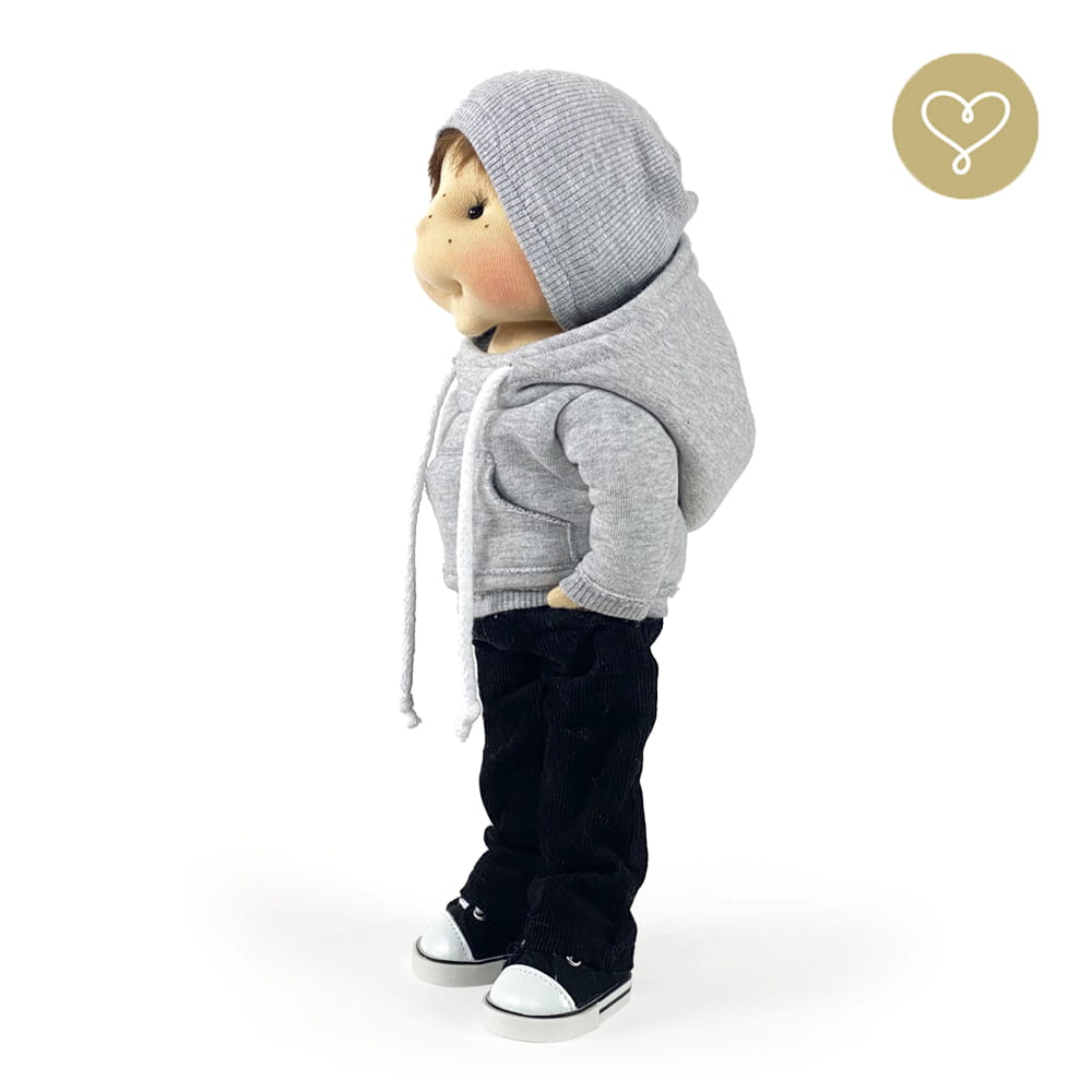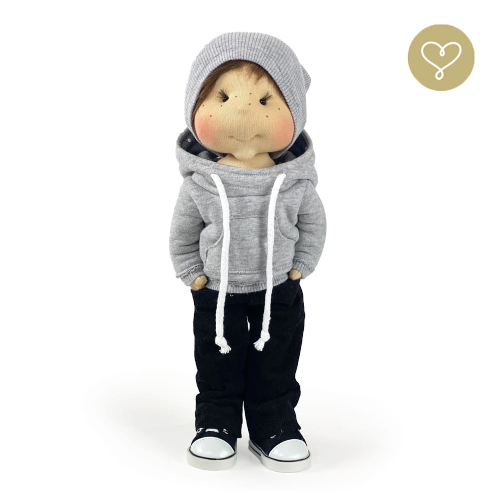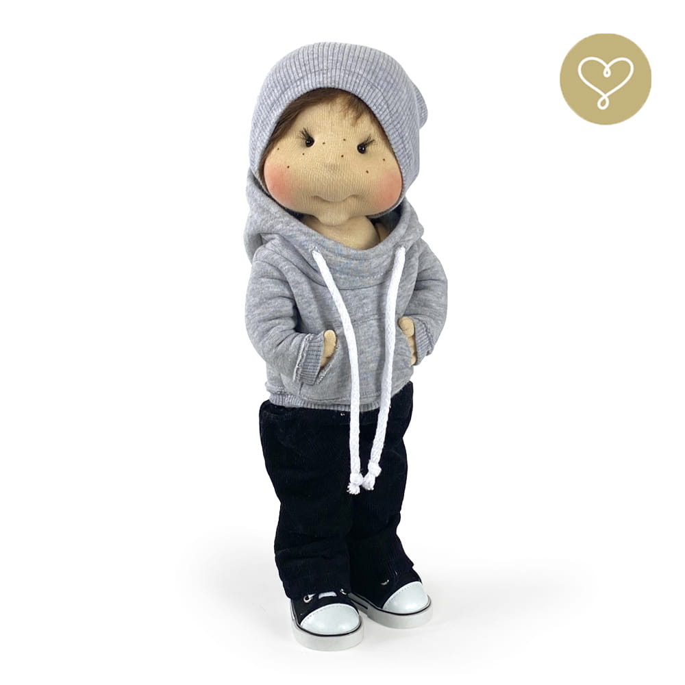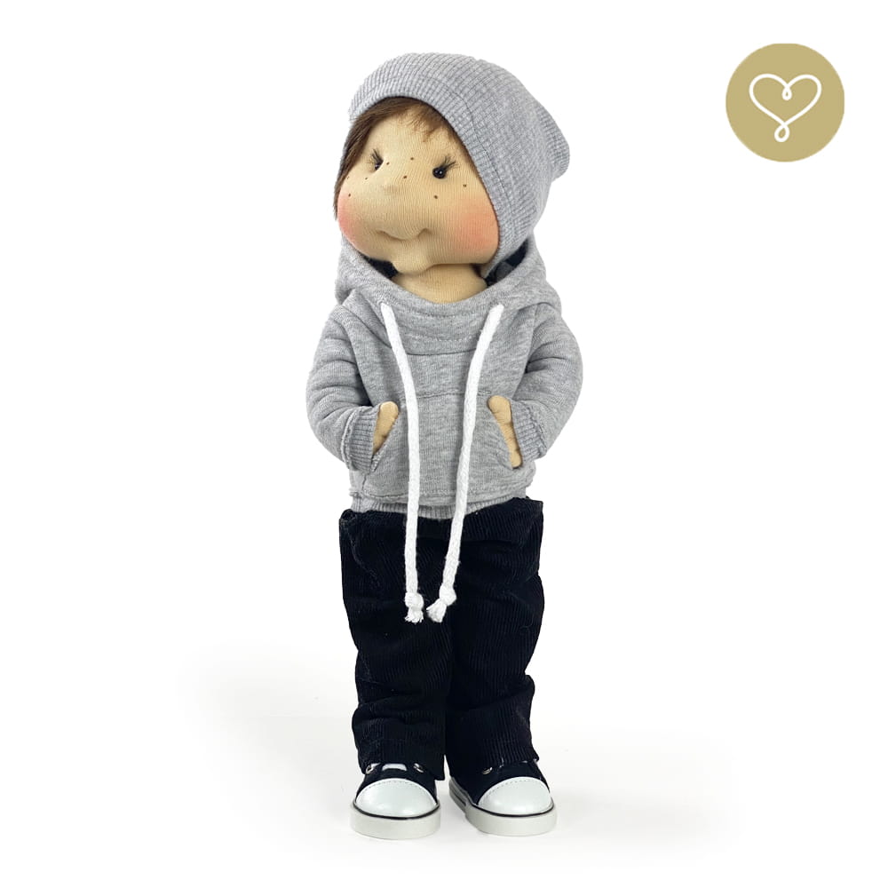 Die Liebe zum Detail und größte Sorgfalt steckt in jeder Faser dieser Puppe. Sie ist 40 cm groß, weich und sehr angenehm. Trotz dem Verzicht auf Drähte oder andere stabilisierende Elemente, kann eine LulluDoll selbstständig stehen und sitzen. Ihr Kopf und die Gliedmaßen sind beweglich. Das weiche Haar fühlt sich nahezu echt an, es lässt sich wunderbar frisieren und hat eine gute Kämmbarkeit. Die Materialien werden sorgsam ausgewählt, sind von höchster Qualität und Strapazierfähigkeit, weil die Sicherheit unerer Artikel höchste Priorität hat. Die Kleidung lässt sich leicht an- und umziehen. Im Shop unter dem Punkt Kleidung finden Sie weitere Kleidungsstücke im Angebot.