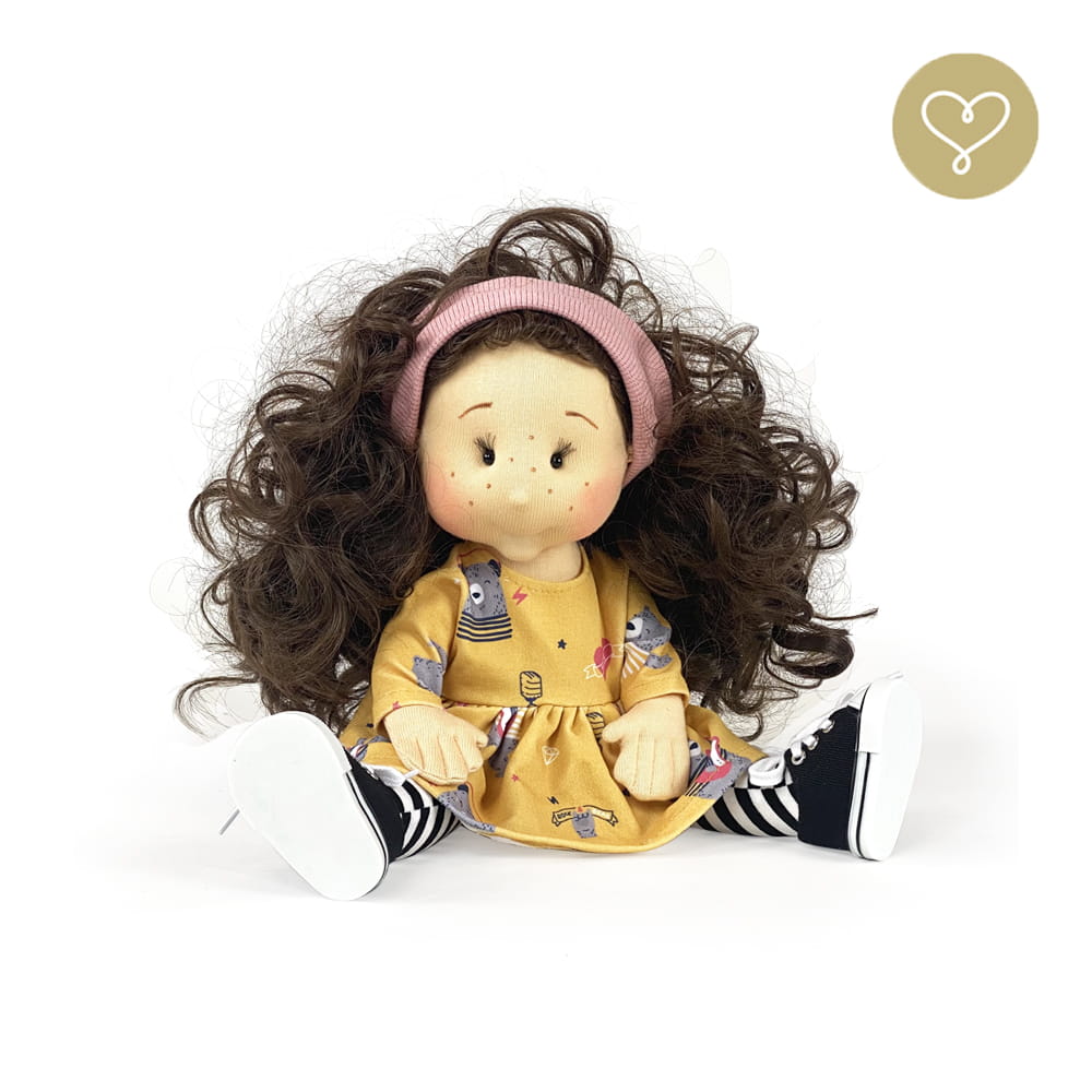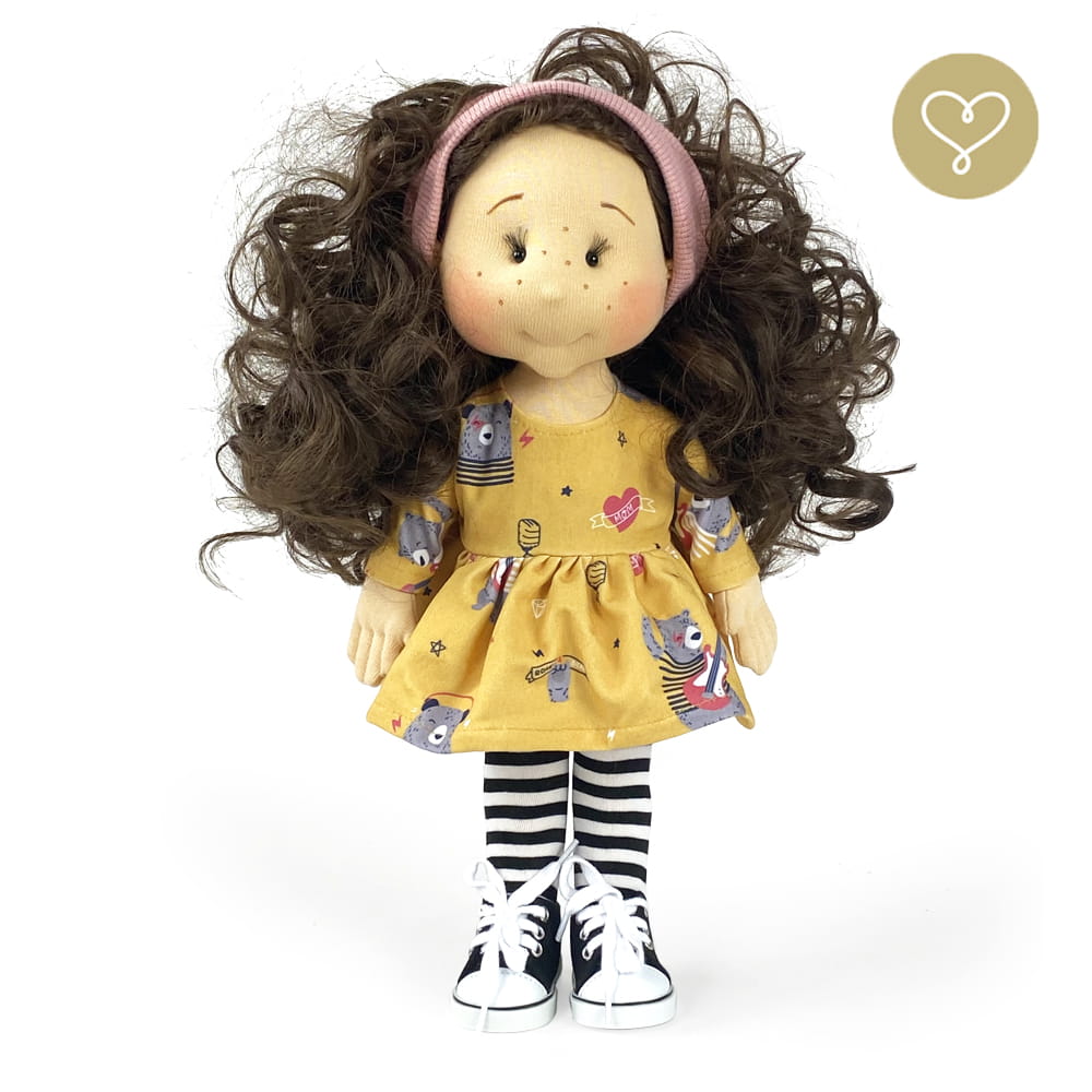 Die Liebe zum Detail und größte Sorgfalt steckt in jeder Faser dieser Puppe. Sie ist 40 cm groß, weich und sehr angenehm. Trotz dem Verzicht auf Drähte oder andere stabilisierende Elemente, kann eine LulluDoll selbstständig stehen und sitzen. Ihr Kopf und die Gliedmaßen sind beweglich. Das weiche Haar fühlt sich nahezu echt an, es lässt sich wunderbar frisieren und hat eine gute Kämmbarkeit. Die Materialien werden sorgsam ausgewählt, sind von höchster Qualität und Strapazierfähigkeit, weil die Sicherheit unerer Artikel höchste Priorität hat. Die Kleidung lässt sich leicht an- und umziehen. Im Shop unter dem Punkt Kleidung finden Sie weitere Kleidungsstücke im Angebot.