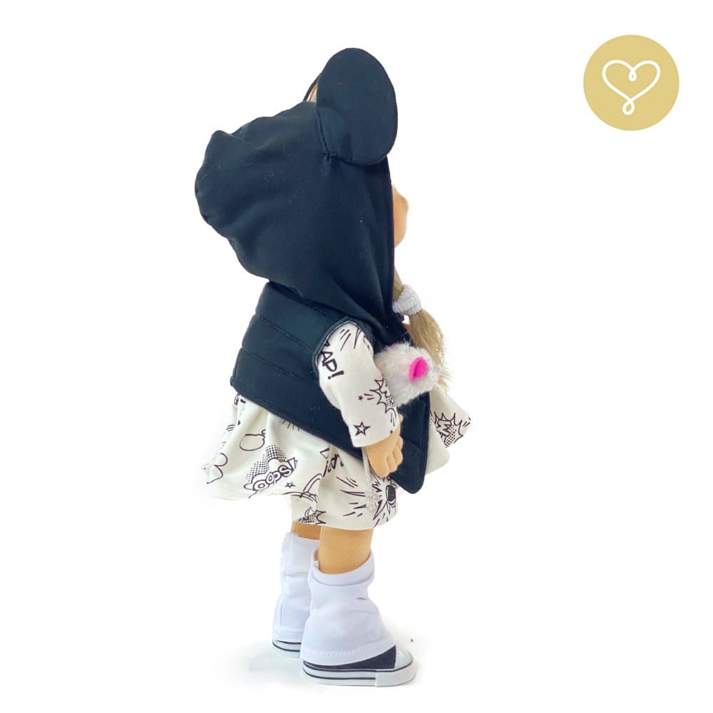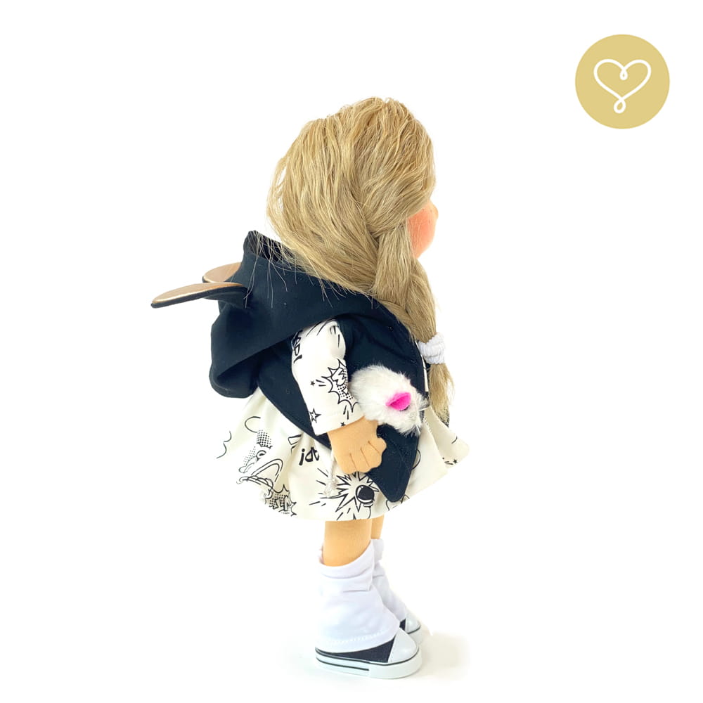 Die Liebe zum Detail und größte Sorgfalt steckt in jeder Faser dieser Puppe. Sie ist 40 cm groß, weich und sehr angenehm. Trotz dem Verzicht auf Drähte oder andere stabilisierende Elemente, kann eine LulluDoll selbstständig stehen und sitzen. Ihr Kopf und die Gliedmaßen sind beweglich. Das weiche Haar fühlt sich nahezu echt an, es lässt sich wunderbar frisieren und hat eine gute Kämmbarkeit. Die Materialien werden sorgsam ausgewählt, sind von höchster Qualität und Strapazierfähigkeit, weil die Sicherheit unerer Artikel höchste Priorität hat. Die Kleidung lässt sich leicht an- und umziehen. Im Shop unter dem Punkt Kleidung finden Sie weitere Kleidungsstücke im Angebot.