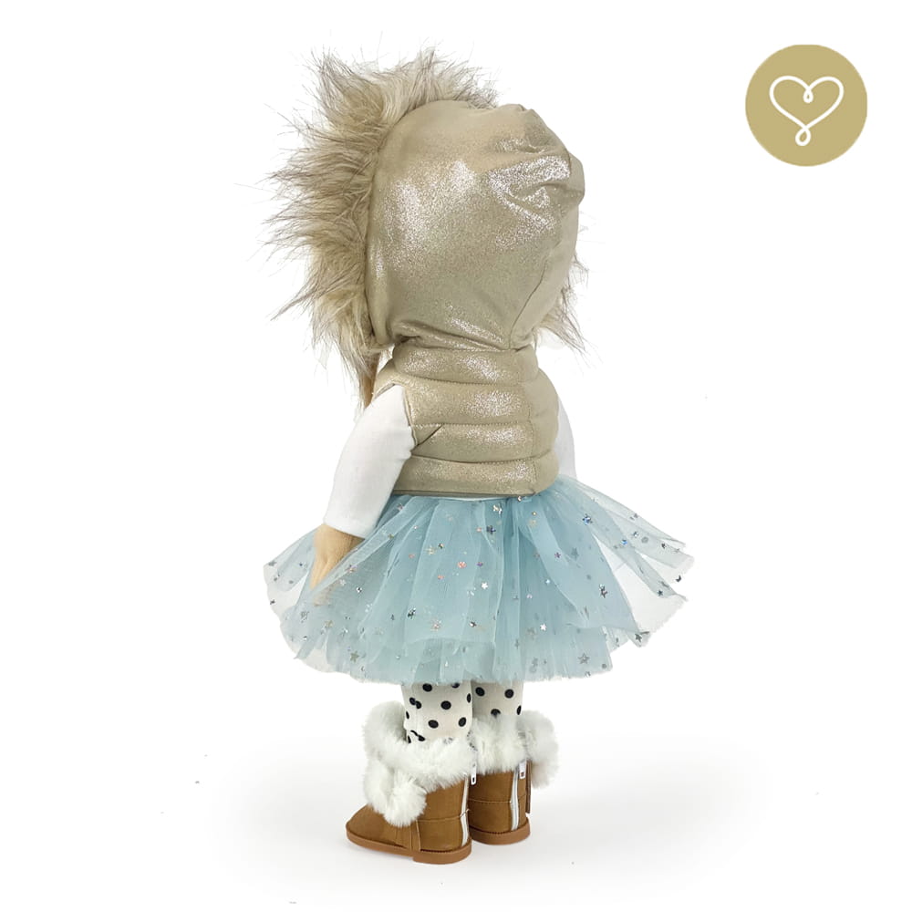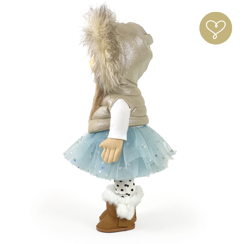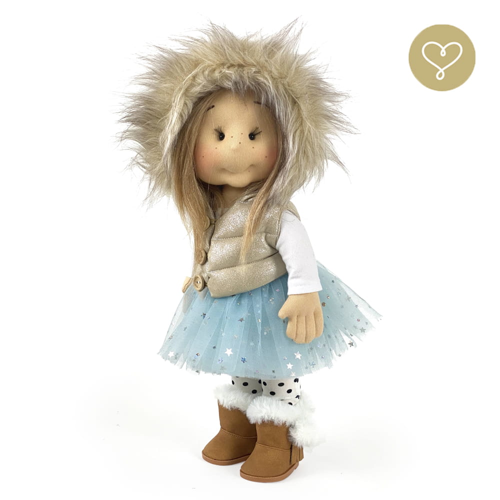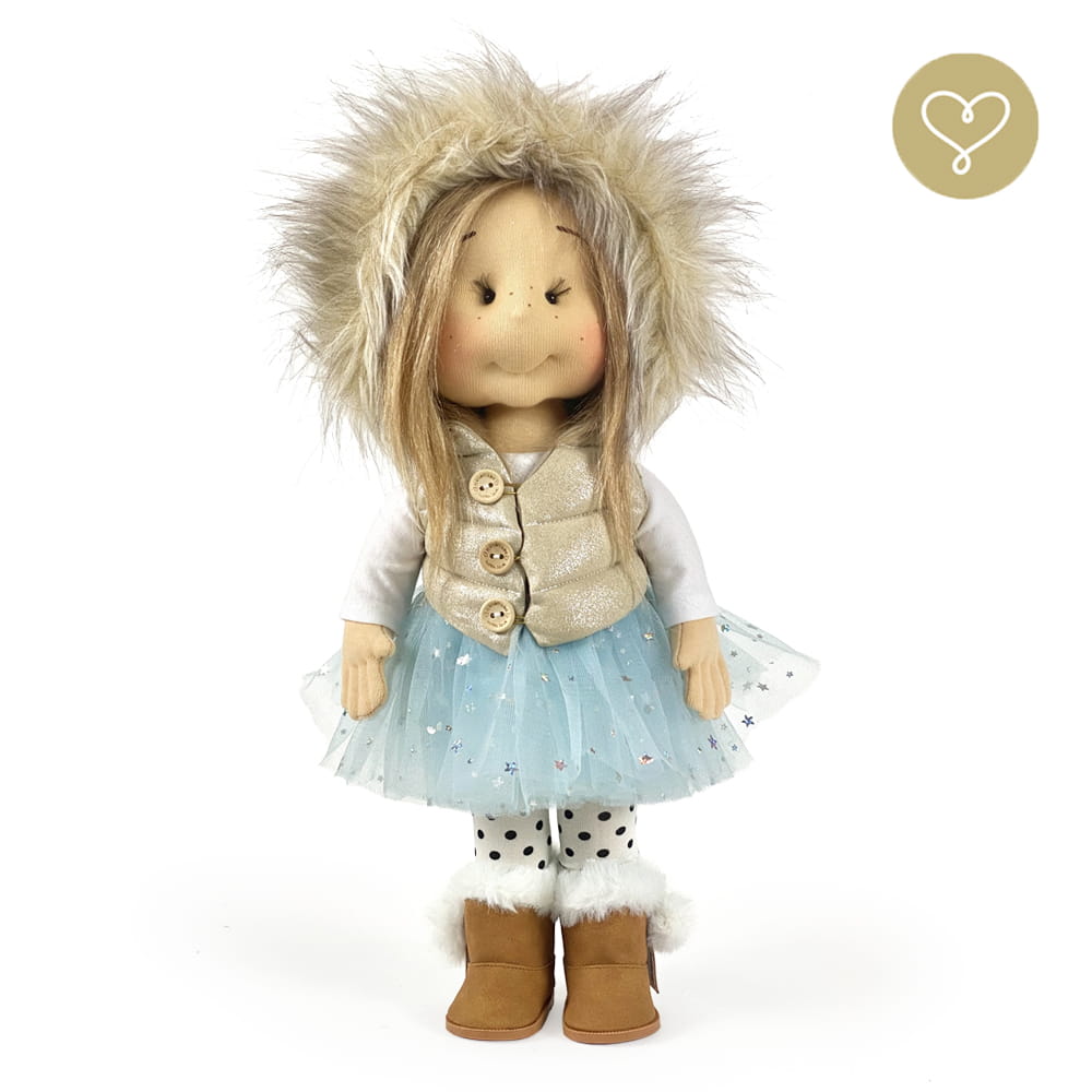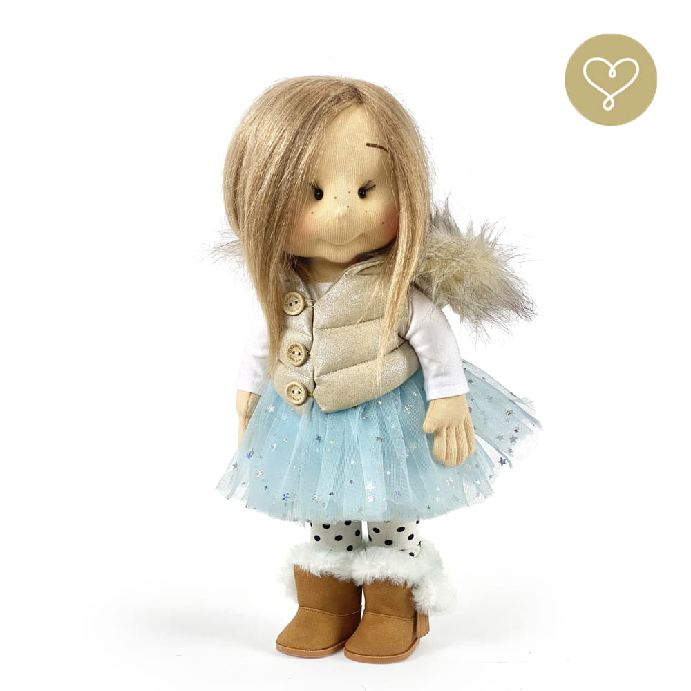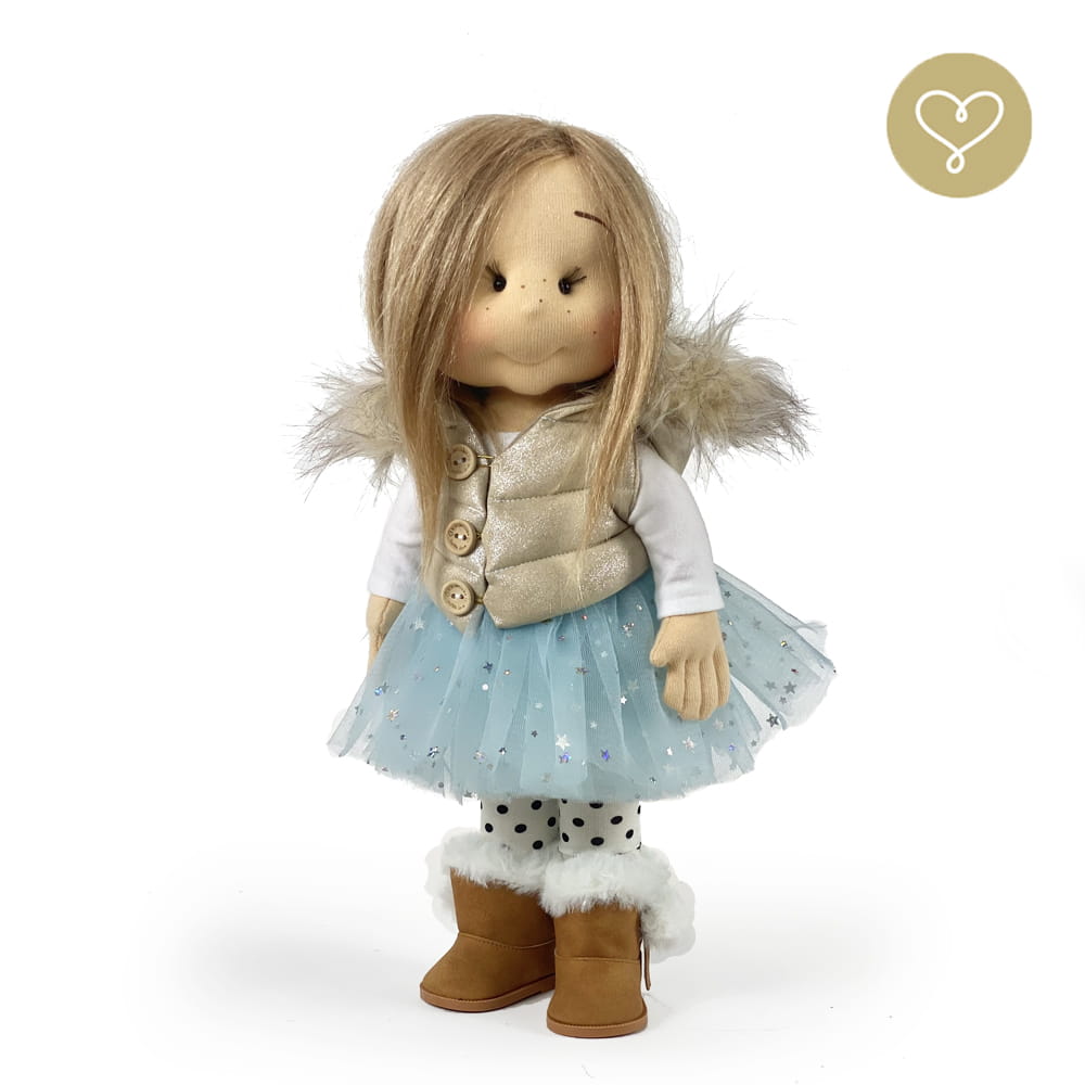 Die Liebe zum Detail und größte Sorgfalt steckt in jeder Faser dieser Puppe. Sie ist 40 cm groß, weich und sehr angenehm. Trotz dem Verzicht auf Drähte oder andere stabilisierende Elemente, kann eine LulluDoll selbstständig stehen und sitzen. Ihr Kopf und die Gliedmaßen sind beweglich. Das weiche Haar fühlt sich nahezu echt an, es lässt sich wunderbar frisieren und hat eine gute Kämmbarkeit. Die Materialien werden sorgsam ausgewählt, sind von höchster Qualität und Strapazierfähigkeit, weil die Sicherheit unerer Artikel höchste Priorität hat. Die Kleidung lässt sich leicht an- und umziehen. Im Shop unter dem Punkt Kleidung finden Sie weitere Kleidungsstücke im Angebot.