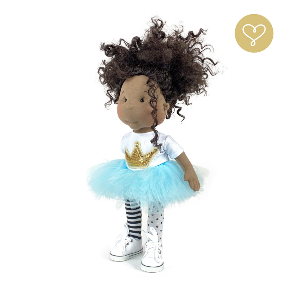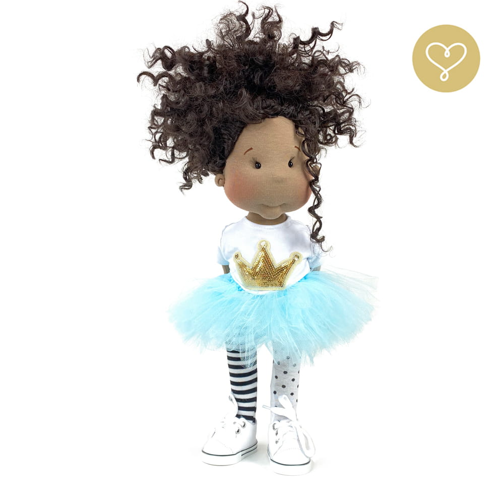 Die Liebe zum Detail und größte Sorgfalt steckt in jeder Faser dieser Puppe. Sie ist 40 cm groß, weich und sehr angenehm. Trotz dem Verzicht auf Drähte oder andere stabilisierende Elemente, kann eine LulluDoll selbstständig stehen und sitzen. Ihr Kopf und die Gliedmaßen sind beweglich. Das weiche Haar fühlt sich nahezu echt an, es lässt sich wunderbar frisieren und hat eine gute Kämmbarkeit. Die Materialien werden sorgsam ausgewählt, sind von höchster Qualität und Strapazierfähigkeit, weil die Sicherheit unerer Artikel höchste Priorität hat. Die Kleidung lässt sich leicht an- und umziehen. Im Shop unter dem Punkt Kleidung finden Sie weitere Kleidungsstücke im Angebot.