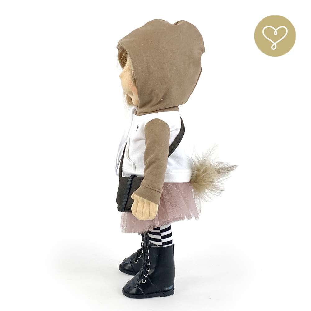 Die Liebe zum Detail und größte Sorgfalt steckt in jeder Faser dieser Puppe. Sie ist 40 cm groß, weich und sehr angenehm. Trotz dem Verzicht auf Drähte oder andere stabilisierende Elemente, kann eine LulluDoll selbstständig stehen und sitzen. Ihr Kopf und die Gliedmaßen sind beweglich. Das weiche Haar fühlt sich nahezu echt an, es lässt sich wunderbar frisieren und hat eine gute Kämmbarkeit. Die Materialien werden sorgsam ausgewählt, sind von höchster Qualität und Strapazierfähigkeit, weil die Sicherheit unerer Artikel höchste Priorität hat. Die Kleidung lässt sich leicht an- und umziehen. Im Shop unter dem Punkt Kleidung finden Sie weitere Kleidungsstücke im Angebot.