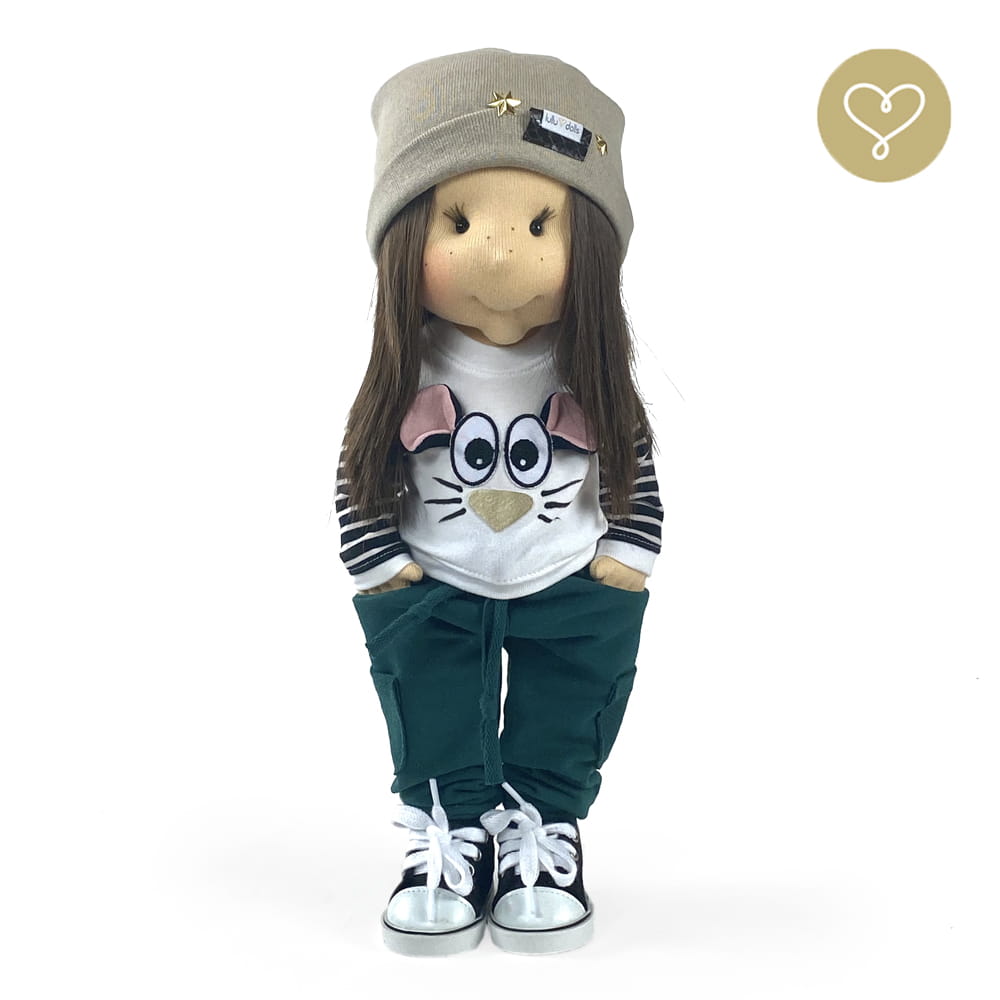 Die Liebe zum Detail und größte Sorgfalt steckt in jeder Faser dieser Puppe. Sie ist 40 cm groß, weich und sehr angenehm. Trotz dem Verzicht auf Drähte oder andere stabilisierende Elemente, kann eine LulluDoll selbstständig stehen und sitzen. Ihr Kopf und die Gliedmaßen sind beweglich. Das weiche Haar fühlt sich nahezu echt an, es lässt sich wunderbar frisieren und hat eine gute Kämmbarkeit. Die Materialien werden sorgsam ausgewählt, sind von höchster Qualität und Strapazierfähigkeit, weil die Sicherheit unerer Artikel höchste Priorität hat. Die Kleidung lässt sich leicht an- und umziehen. Im Shop unter dem Punkt Kleidung finden Sie weitere Kleidungsstücke im Angebot.