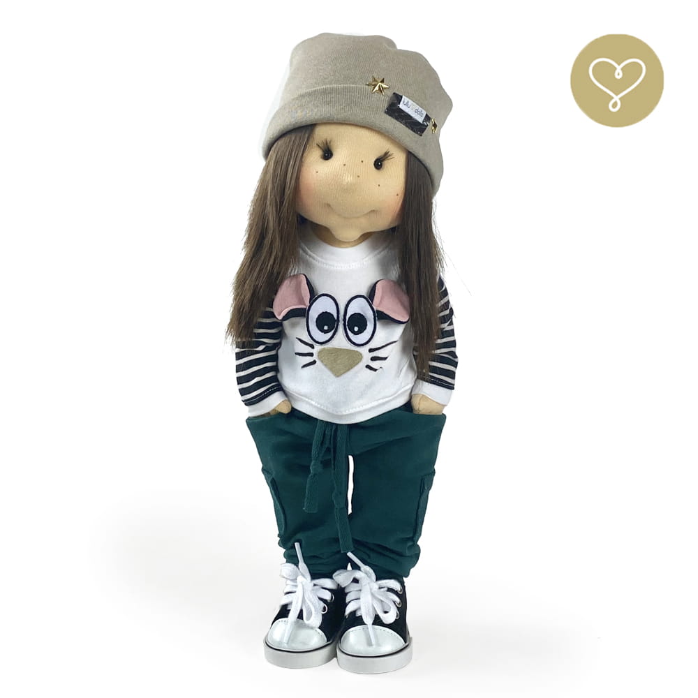 Handgemachte Stoffpuppe neu interpretiert. Genäht in der kleinen Manufaktur Lulludolls in Warschau.