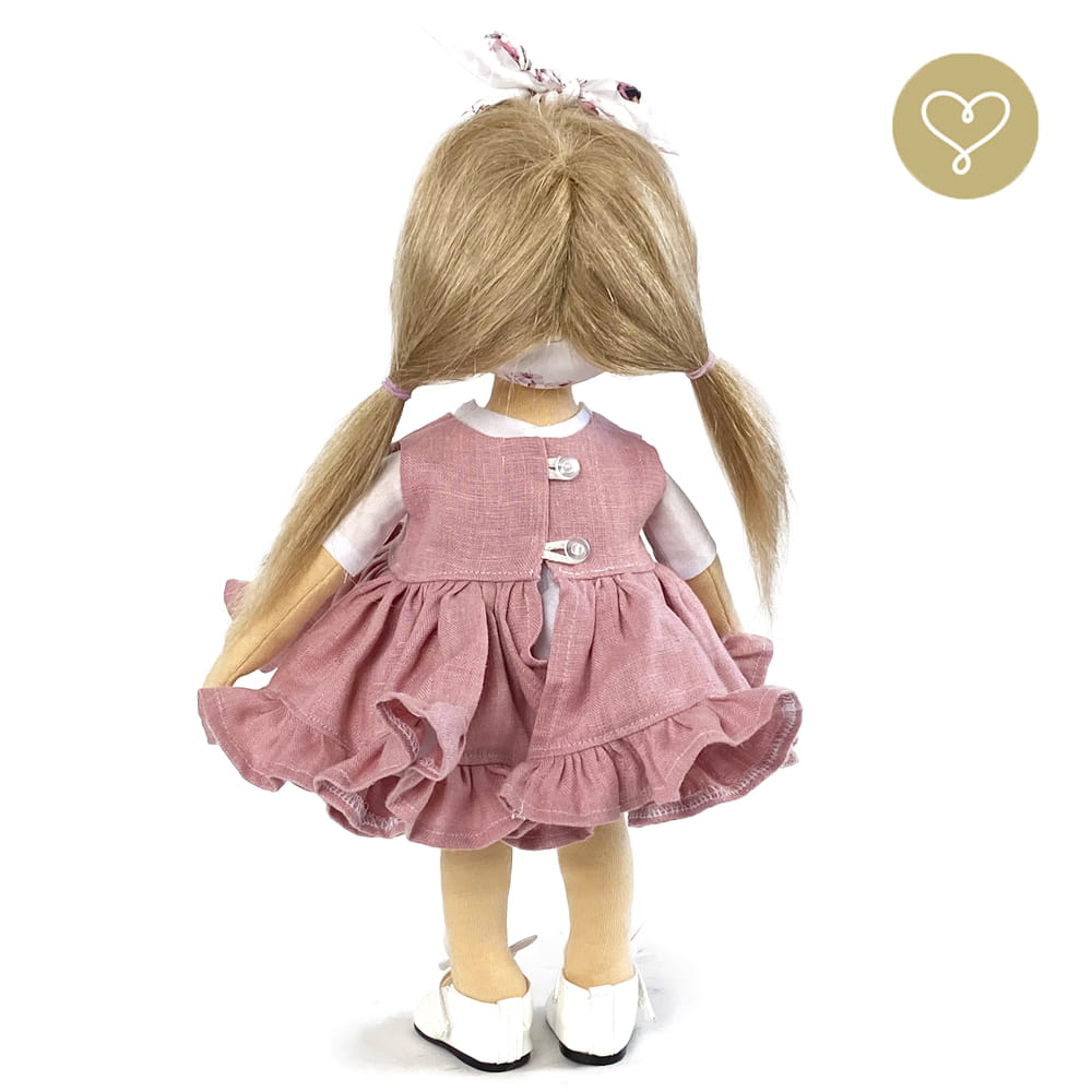 Die Liebe zum Detail und größte Sorgfalt steckt in jeder Faser dieser Puppe. Sie ist 40 cm groß, weich und sehr angenehm. Trotz dem Verzicht auf Drähte oder andere stabilisierende Elemente, kann eine LulluDoll selbstständig stehen und sitzen. Ihr Kopf und die Gliedmaßen sind beweglich. Das weiche Haar fühlt sich nahezu echt an, es lässt sich wunderbar frisieren und hat eine gute Kämmbarkeit. Die Materialien werden sorgsam ausgewählt, sind von höchster Qualität und Strapazierfähigkeit, weil die Sicherheit unerer Artikel höchste Priorität hat. Die Kleidung lässt sich leicht an- und umziehen. Im Shop unter dem Punkt Kleidung finden Sie weitere Kleidungsstücke im Angebot.