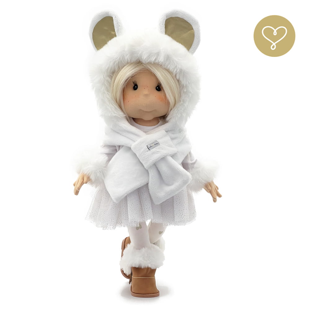Outfit “Naomi”-Velour dress with tulle frill. Sleeves finished with fur.-Velour scarf-hood with ears, trimmed with fur.