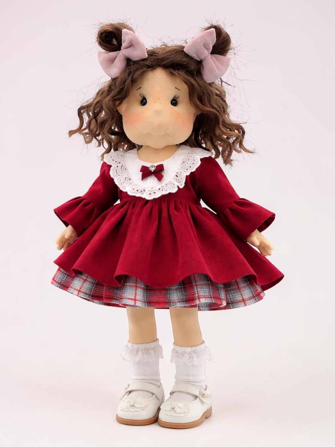 Aksamitna sukienka w kolorze bordowym z rękawkami zakończonymi falbanką, z bawełnianą halką w kratkę. Biała wstawka zakończona koronką.