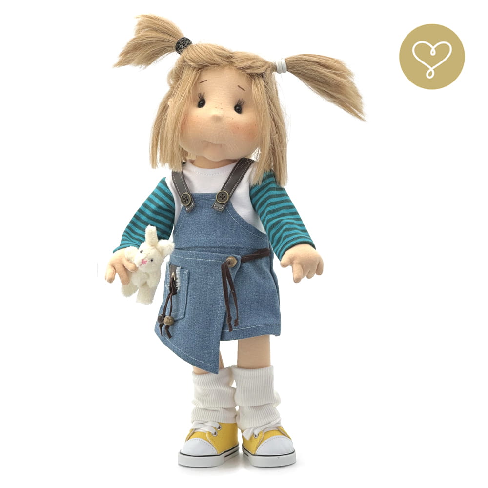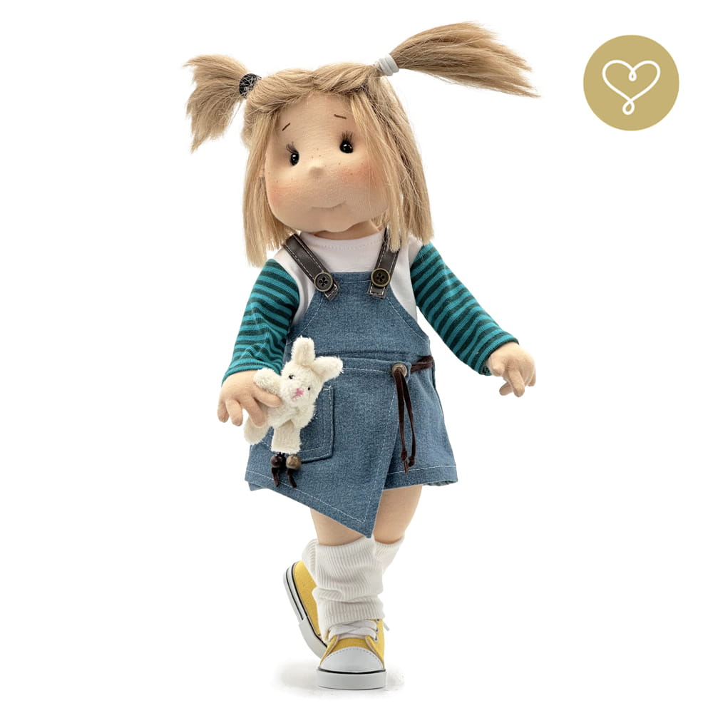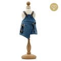 Asymetryczna sukienka jeansowa na szelkach. Kieszeń z boku ozdobiona skórzanymi elementami, drewnianymi koralikami  i rzemieniami.